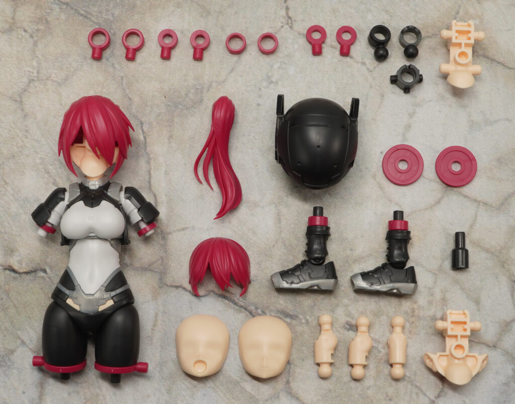 キットの内容はターボコスチュームβ一式、無地表情×2種、頭部基部×2、首関節(横、縦可動それぞれ2個)、リングジョイント一式、シューズ、ヘルメット、ヘルメット用前髪、スタンドジョイントです。