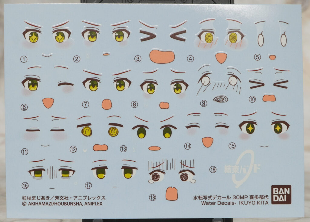 パッケージと水転写デカール。表情やTシャツの結束バンドロゴを再現できるデカールが付属。