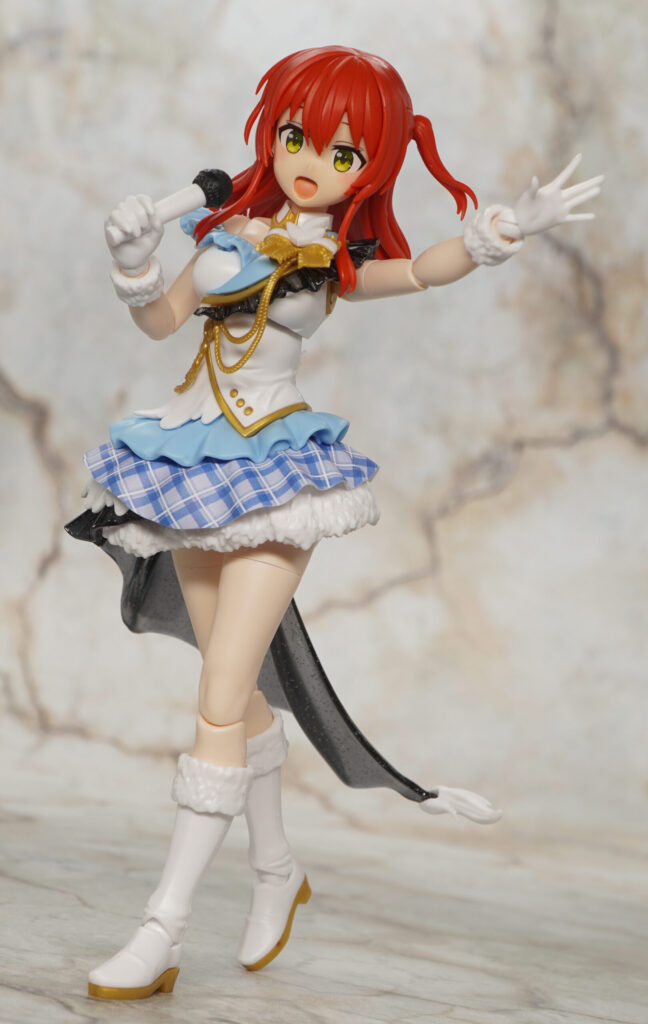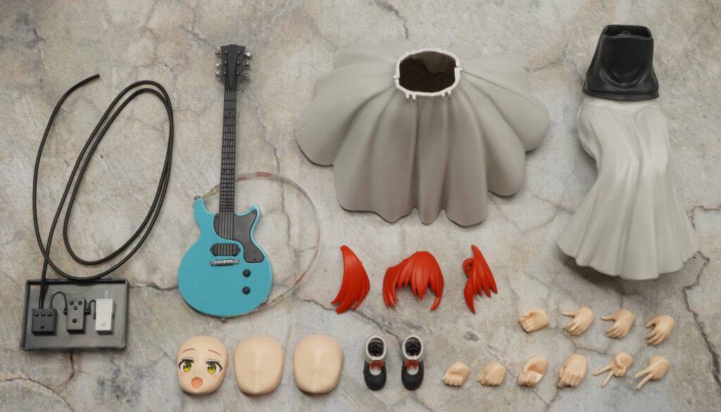 付属品は表情パーツ×2種、無地表情×2、ハンドパーツ一式、前屈み前髪、スカート×2種、座りポーズボディ、靴、エフェクター、ギター、マイクスタンドです。