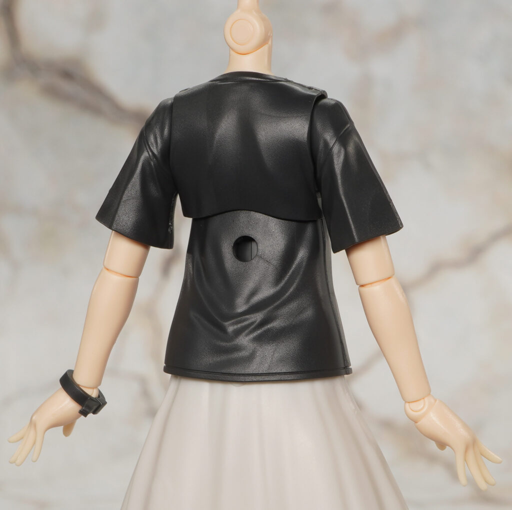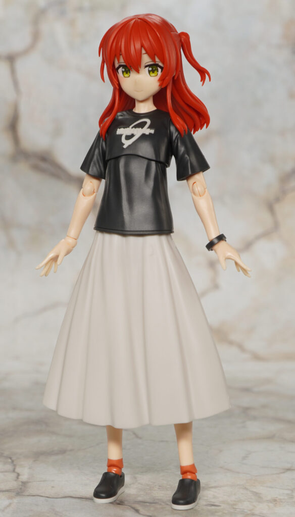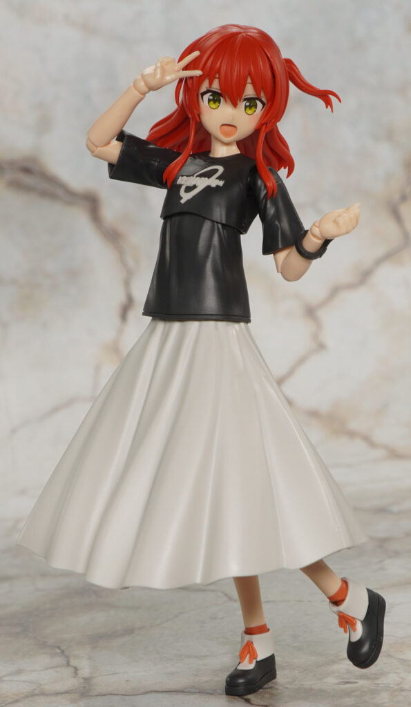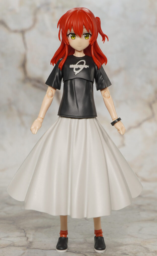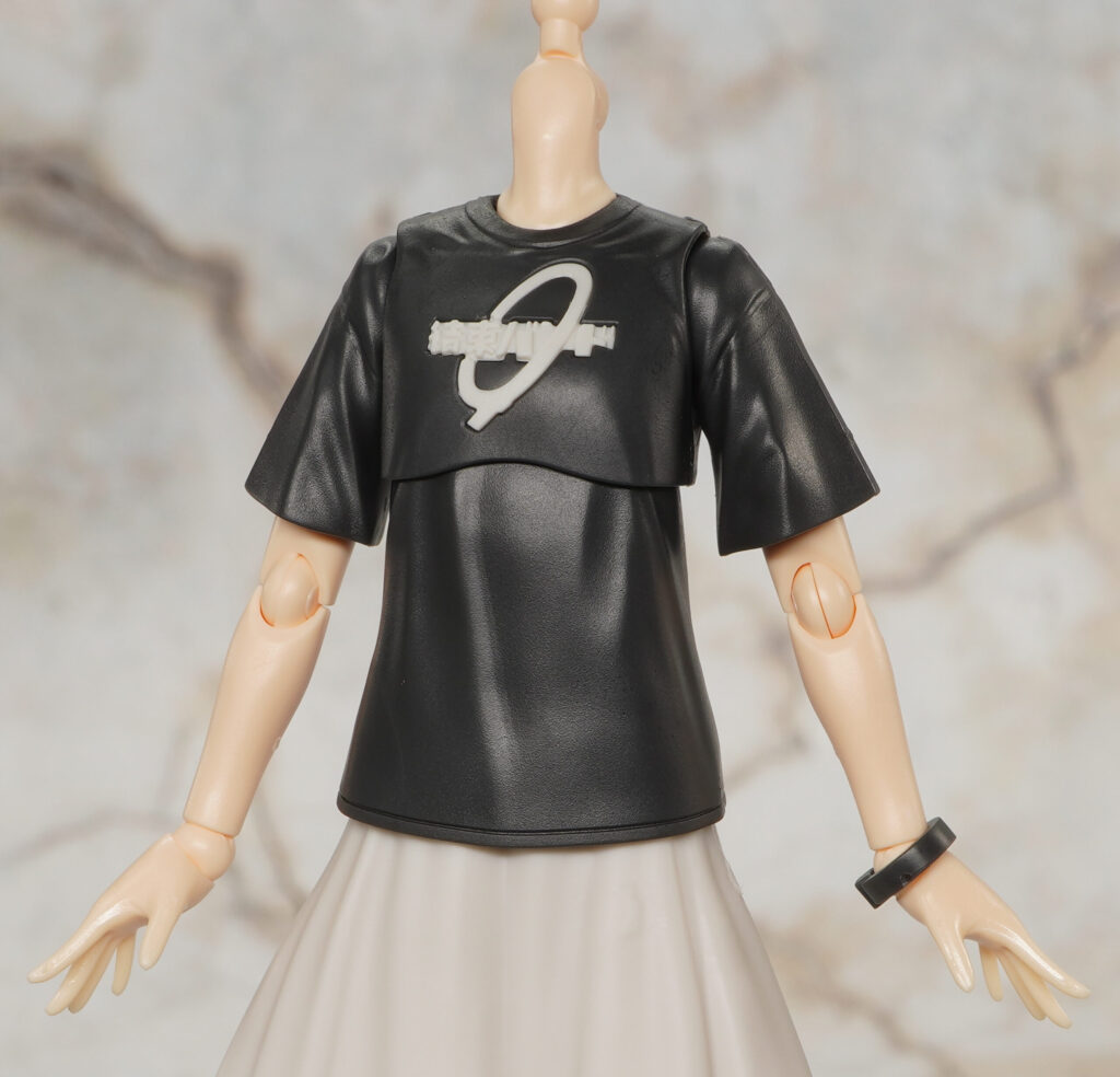 結束バンドTシャツに軟質パーツ製の白ロングスカートコーデで、スカートを動きの付いた物に変えたり座りポーズなども再現できます。