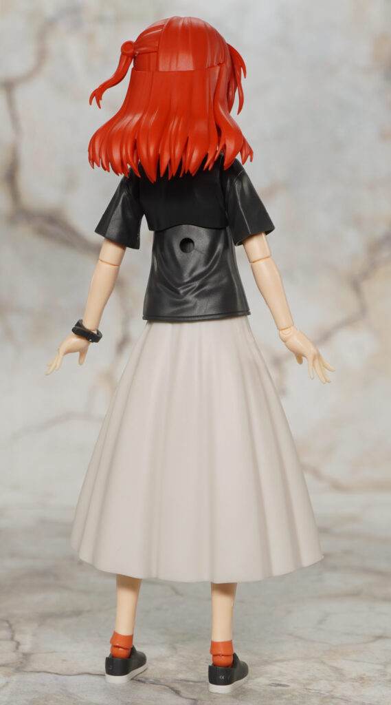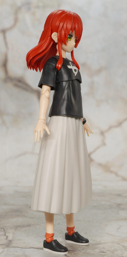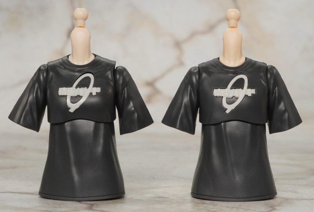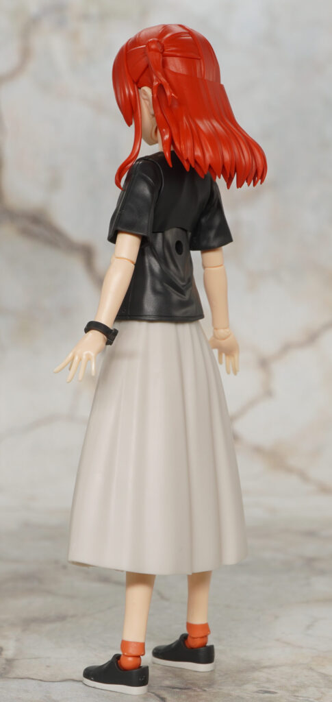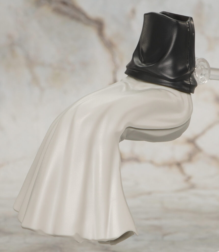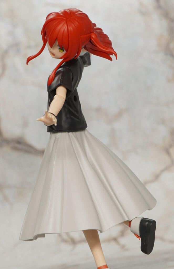 結束バンドTシャツに軟質パーツ製の白ロングスカートコーデで、スカートを動きの付いた物に変えたり座りポーズなども再現できます。