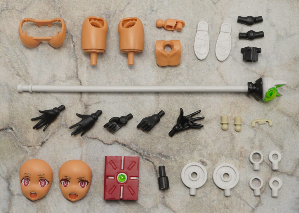 付属品は表情パーツ×3種、ハンドパーツ×4種、杖、本、ヘアパーツジョイント、リングジョイント一式、スタンドジョイントです。