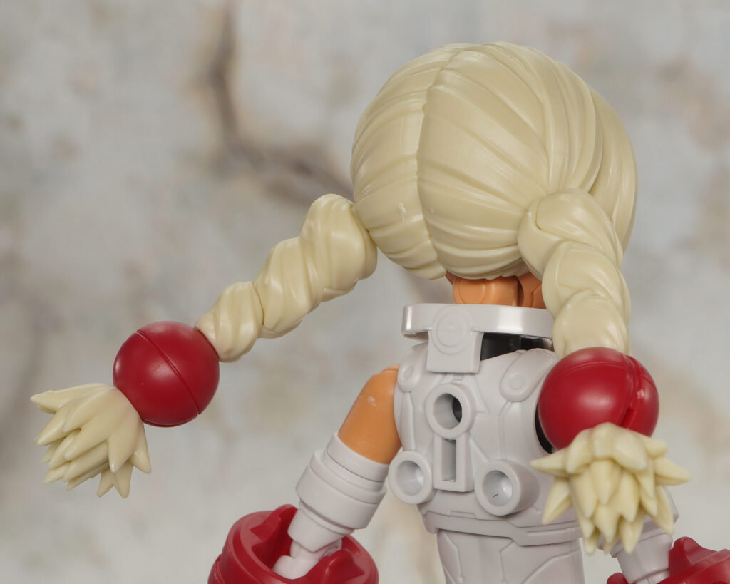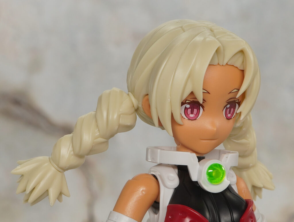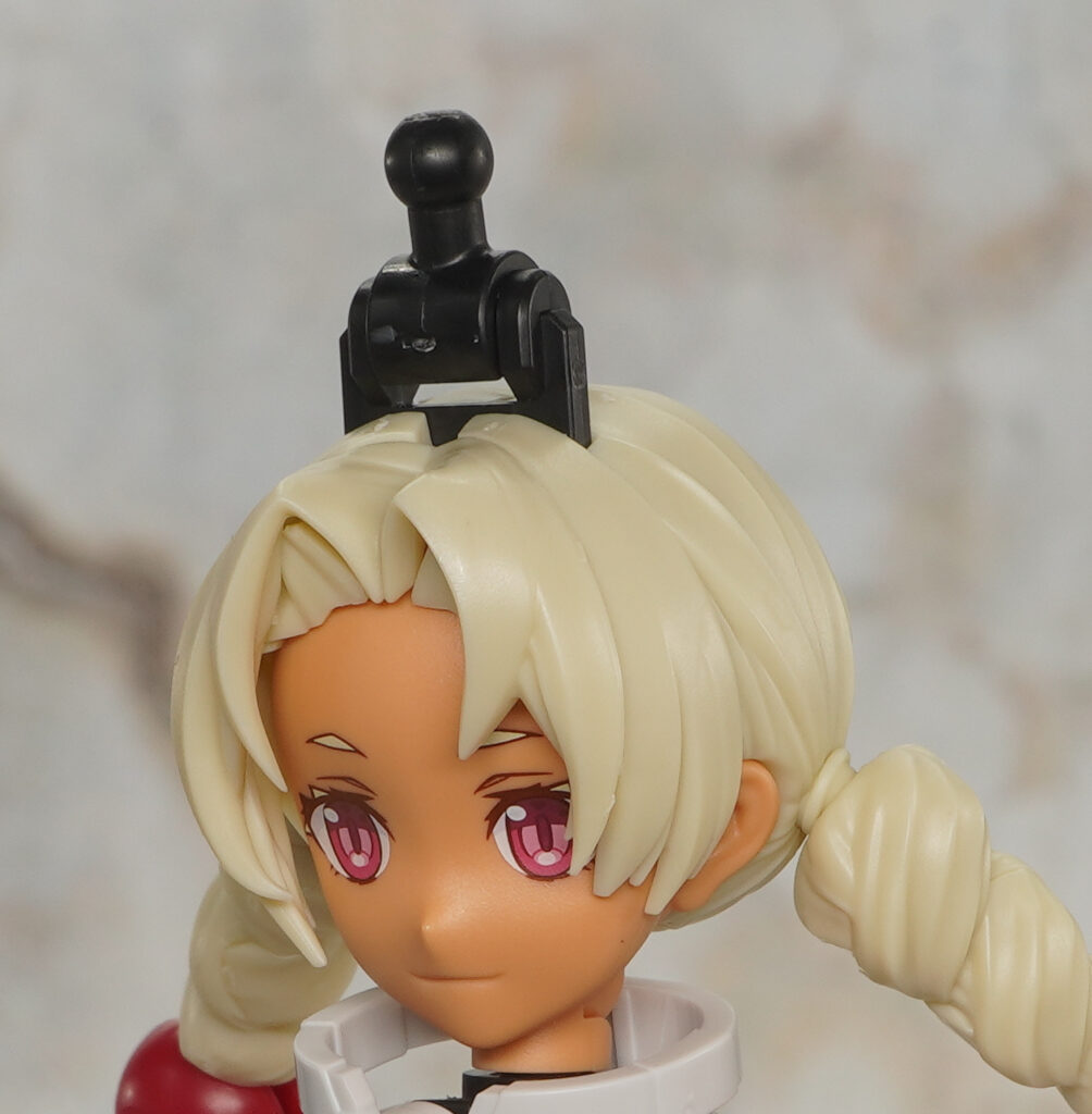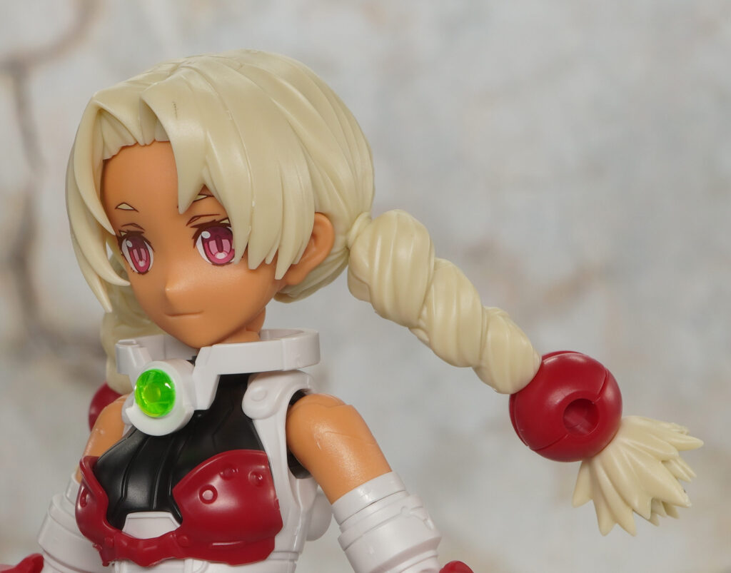 こちらは帽子無しの状態で、太三つ編みおさげはボール軸接続で先端の赤タマは球体関節みたいに可動。