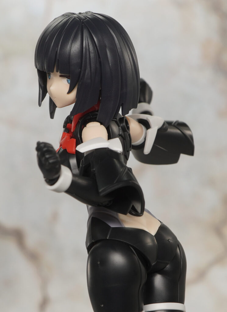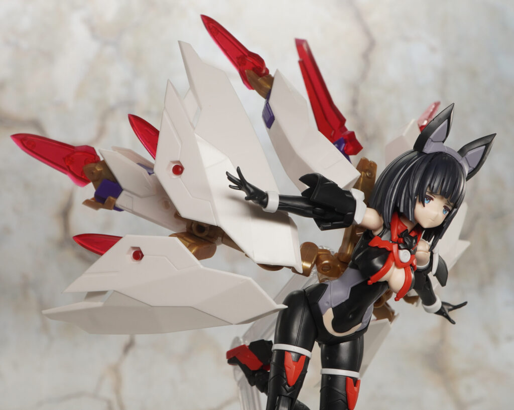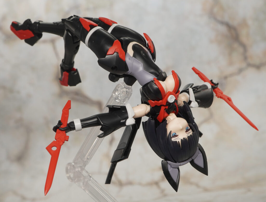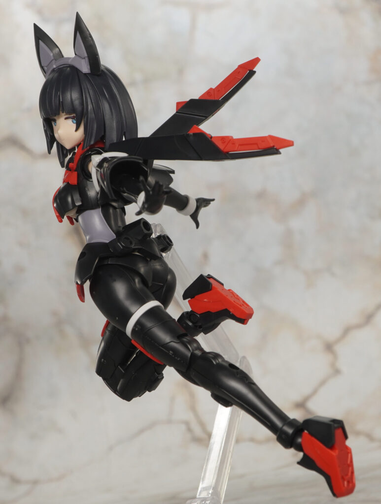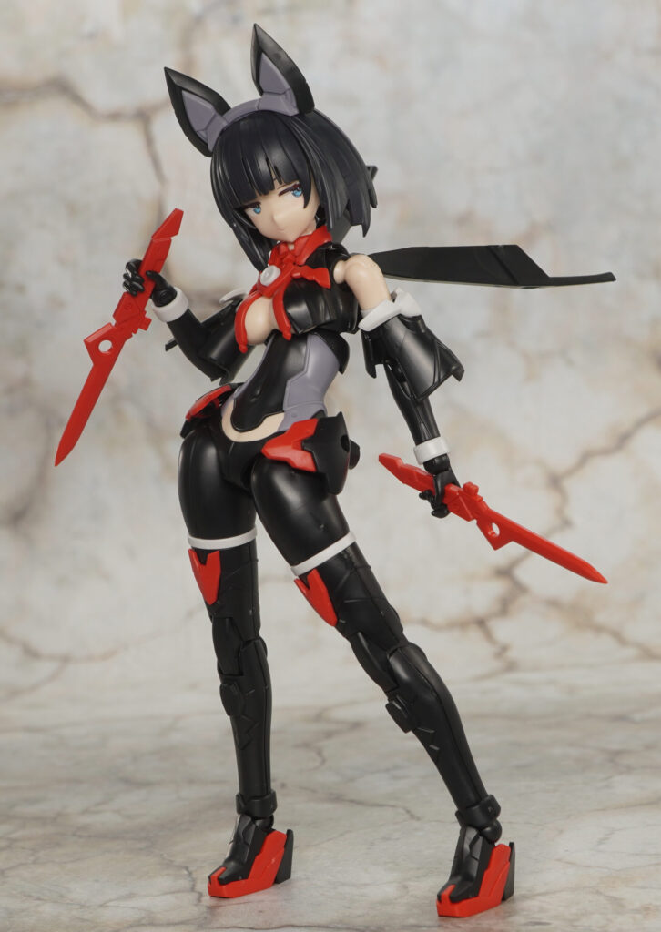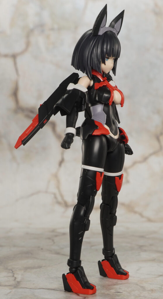 首もとの装飾や太ももの蓋、アームドモード時のカチューシャなどキツネっぽい意匠で、全体的にシュっとしたSFダーク忍者っぽい装い。