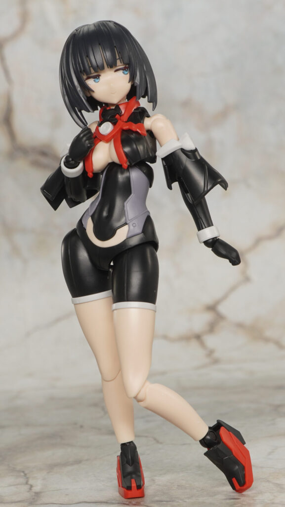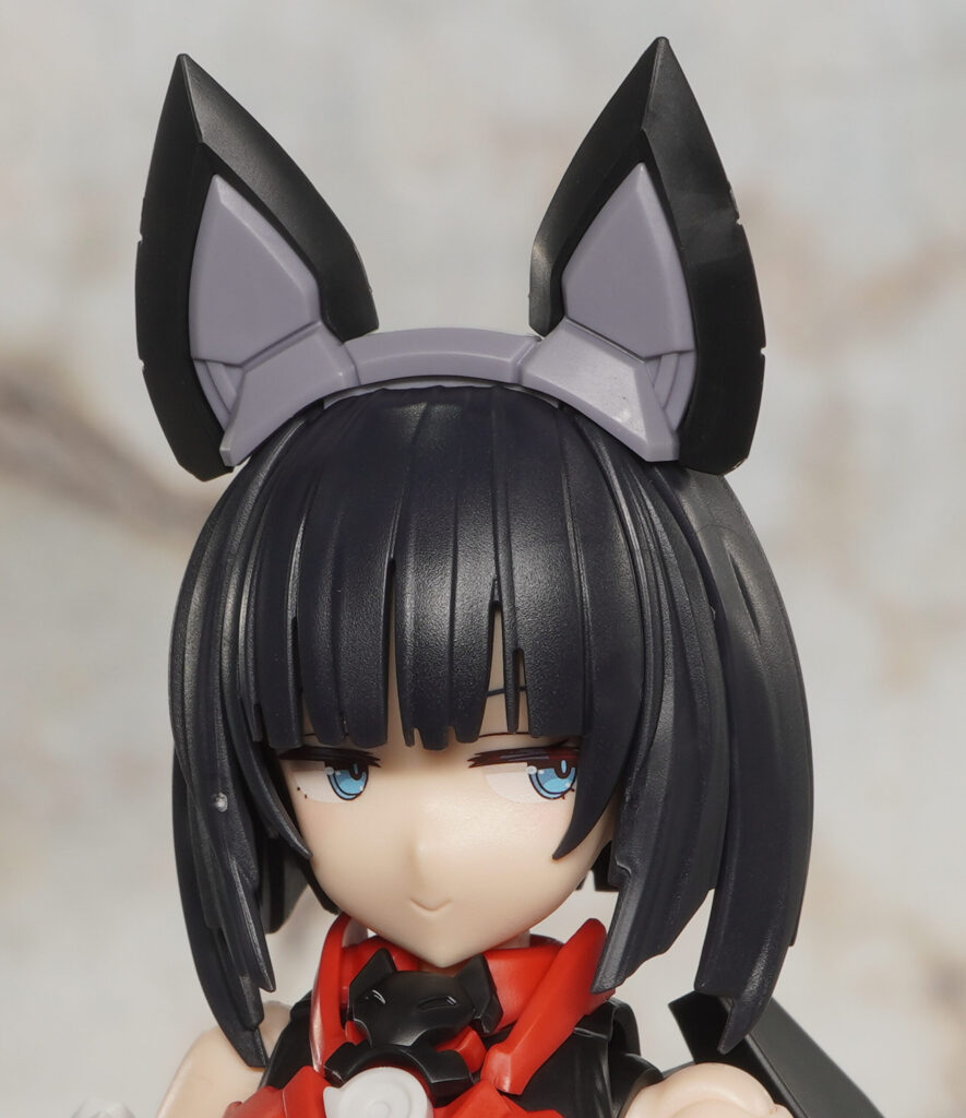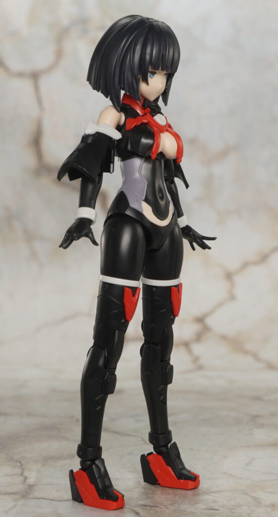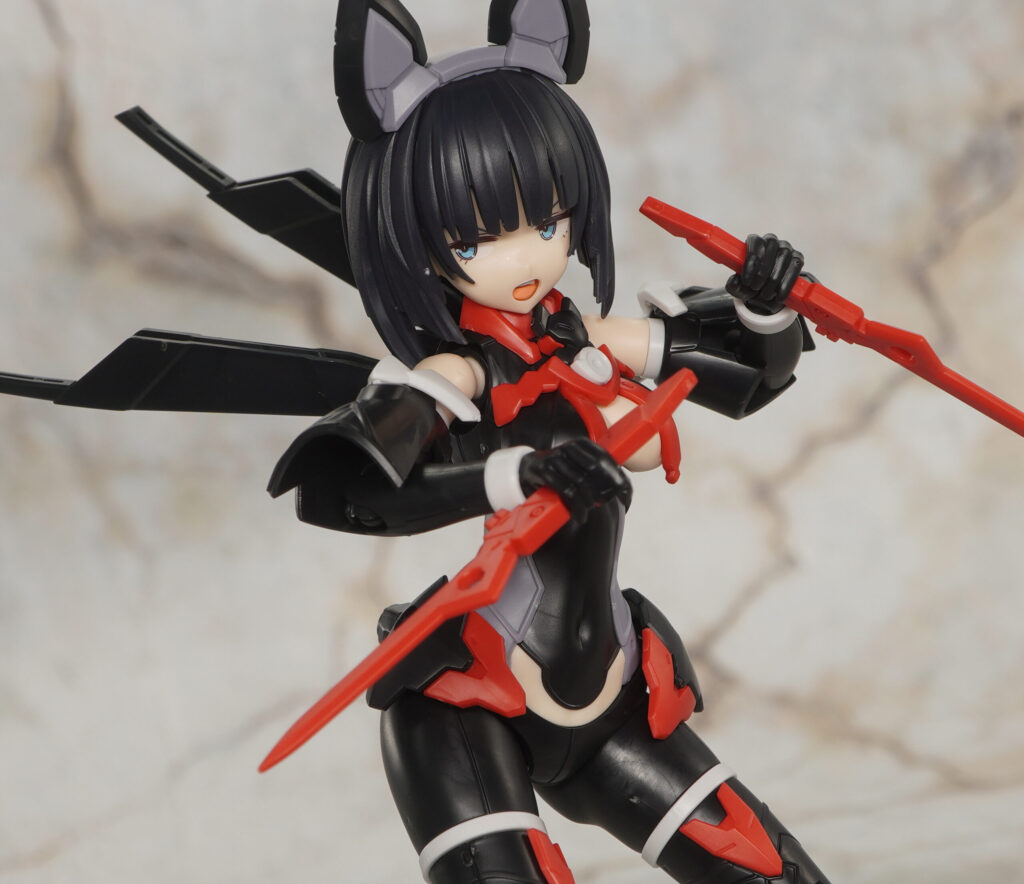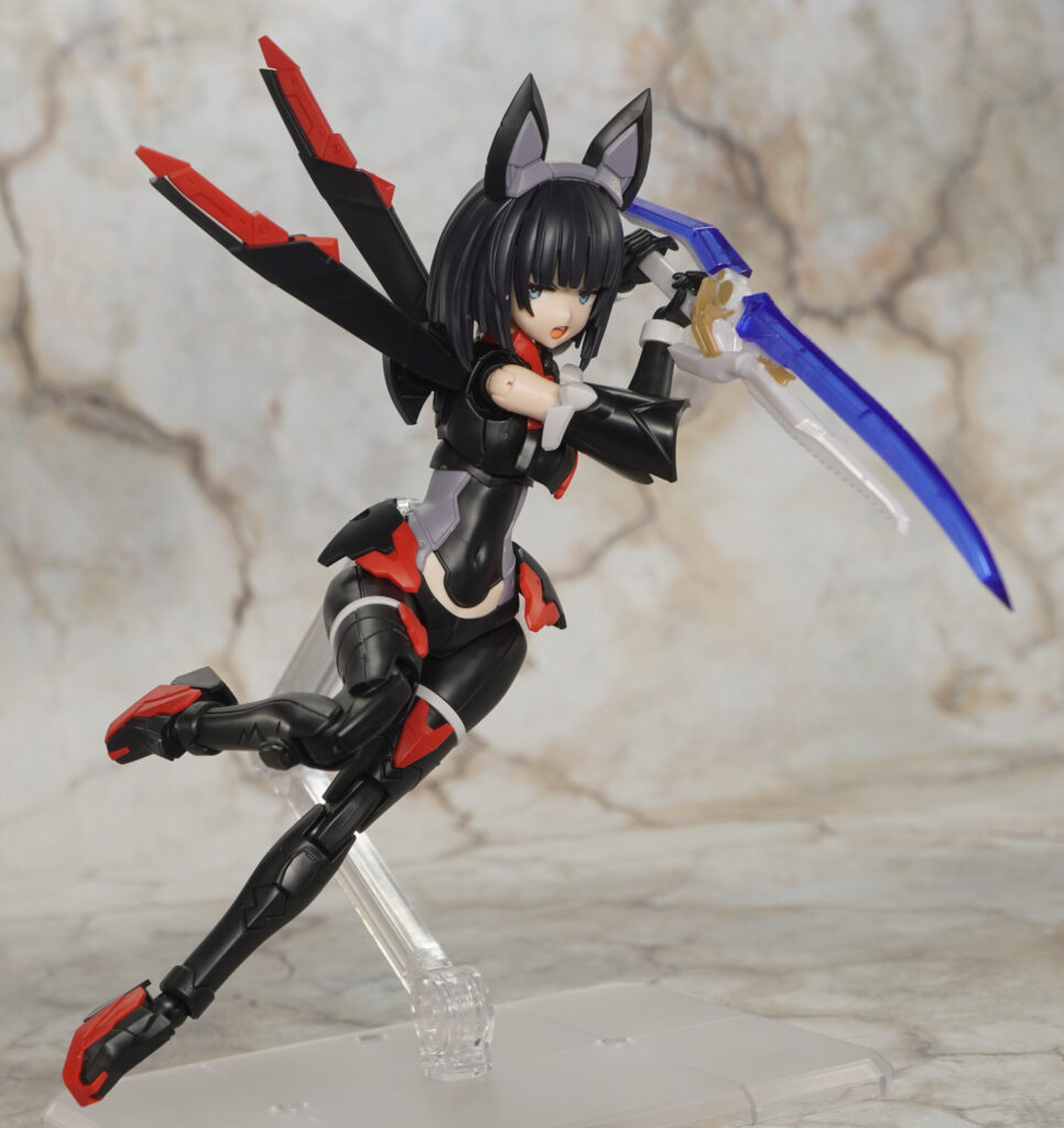 首もとの装飾や太ももの蓋、アームドモード時のカチューシャなどキツネっぽい意匠で、全体的にシュっとしたSFダーク忍者っぽい装い。