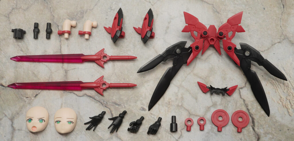 付属品は表情パーツ×3種、ハンドパーツ×3種、アームドモード一式、リングジョイント一式、レイピア×2、スタンドジョイントです。