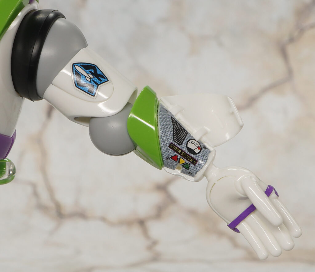 左腕のカバーが開閉しシールでコミュニケーターを再現。