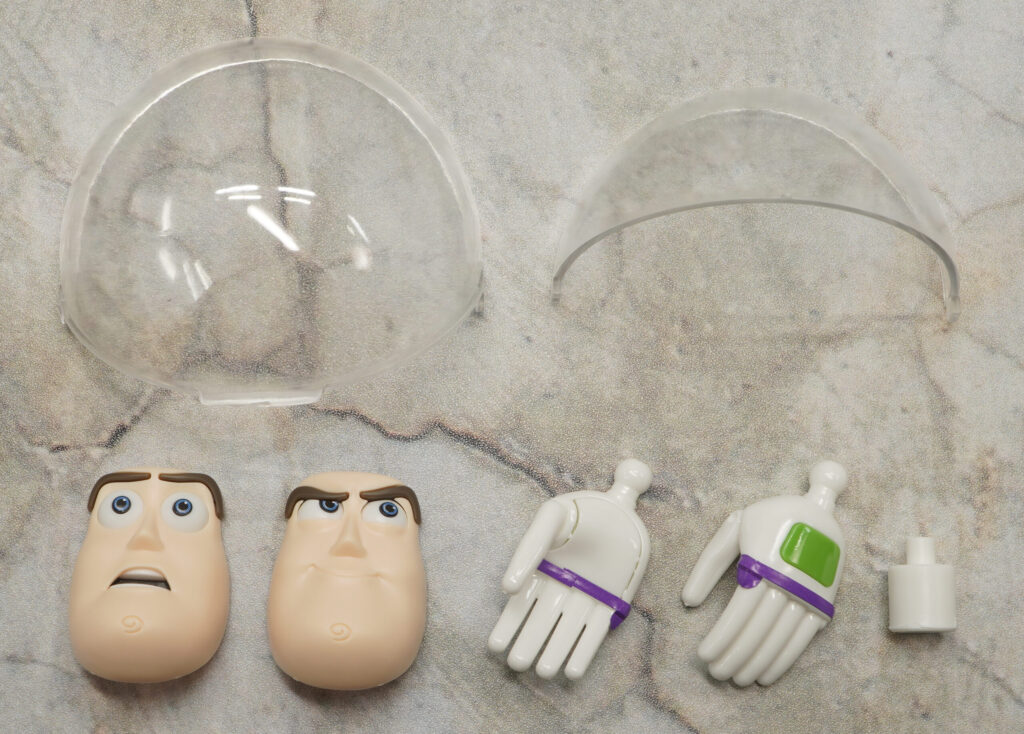 付属品は表情パーツ×3種、ハンドパーツ×2種、ヘルメット、スタンドジョイントです。