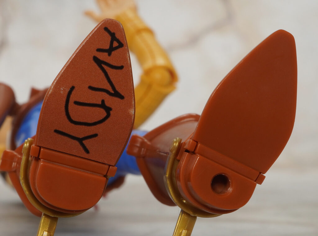 右足裏には元々の持ち主である”ANDY”(アンディ)か新しい持ち主の”Bonnie”(ボニー)のサインシールを貼ることが可能。