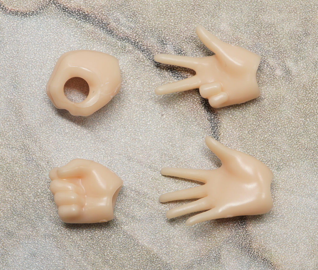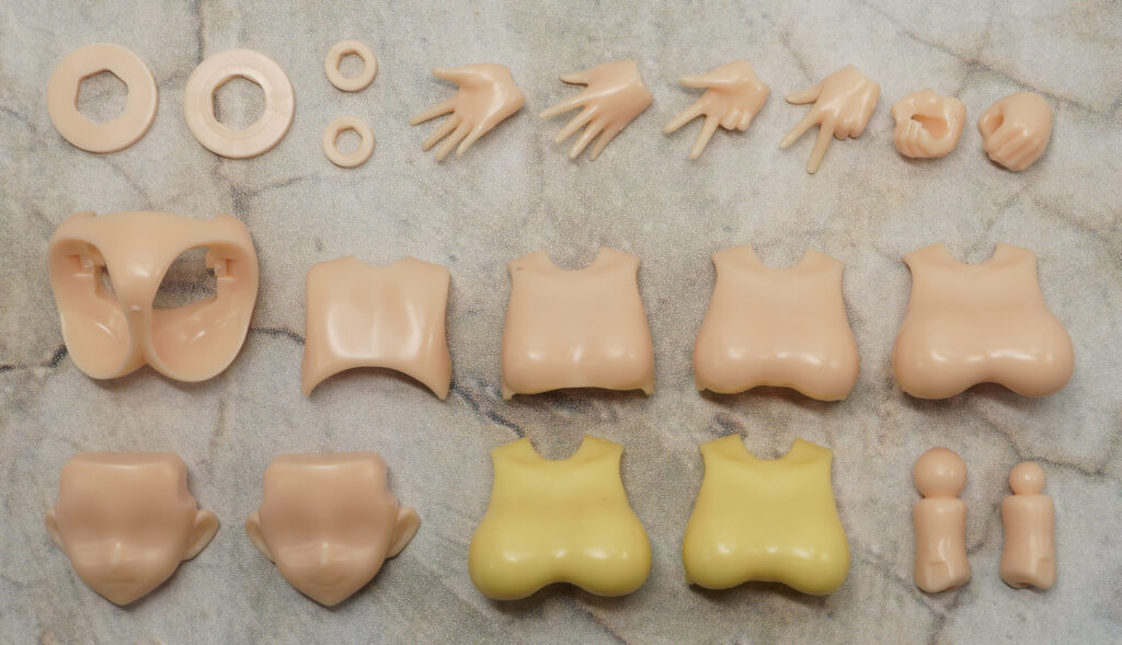 付属品は表情パーツ×1、無地表情×2種、ハンドパーツ×4種、首関節×3種、ボインパーツ×3種(2色)、パンツ×2色、リングジョイント一式×2色です。