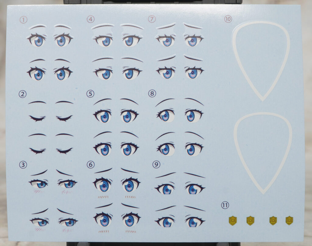 表情は印刷済みと無地がそれぞれ3種類ずつ付属し口内は別パーツ。