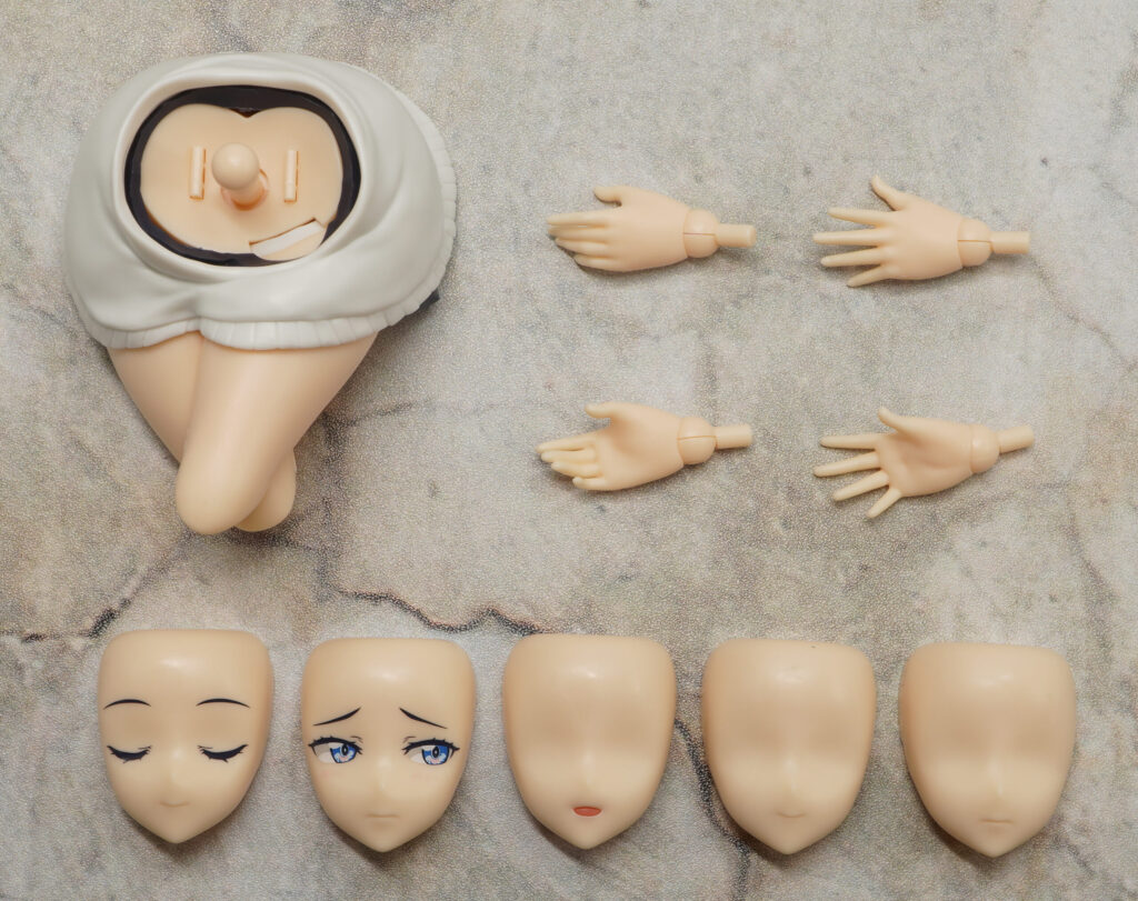 付属品は表情パーツ×3種、無地表情×3種、ハンドパーツ×3種、座りポーズ用下半身です。