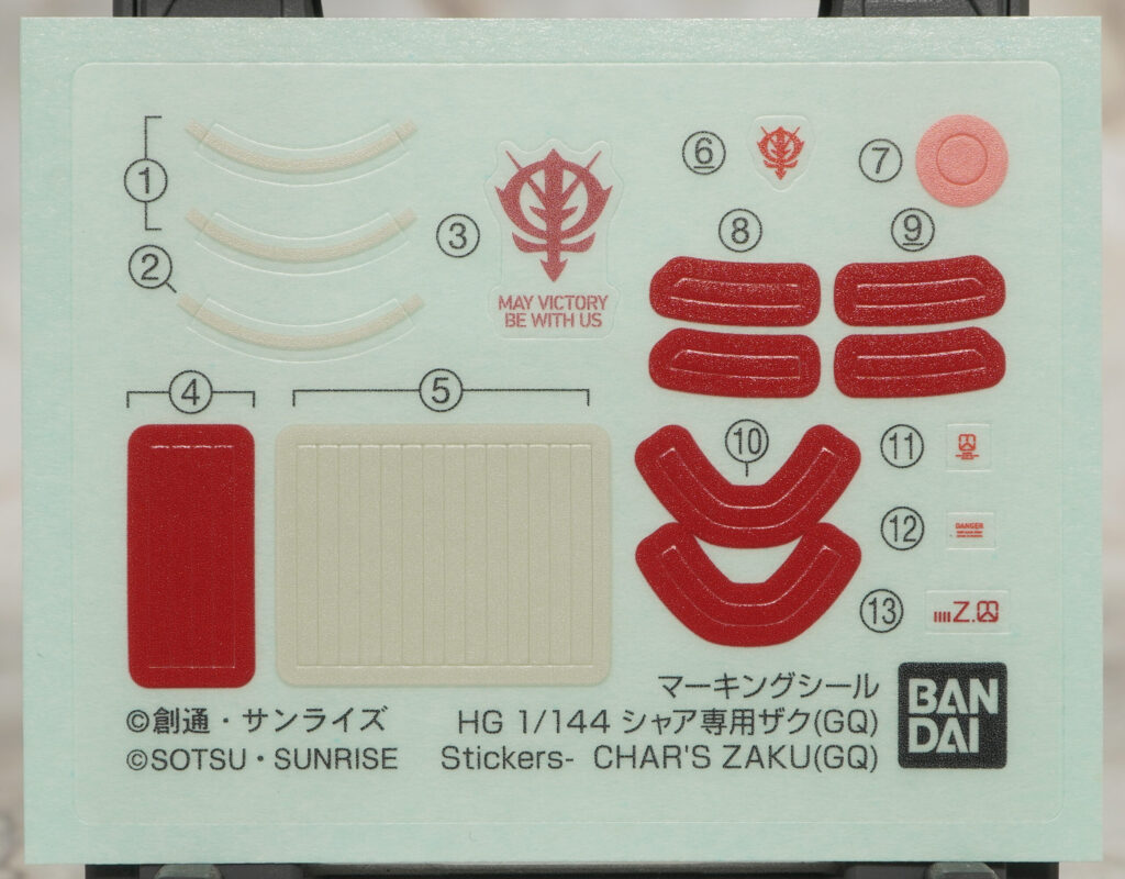 パッケージとシール。モノアイや赤白ライン、ジオンエンブレムなどを再現するマーキングシールが付属。