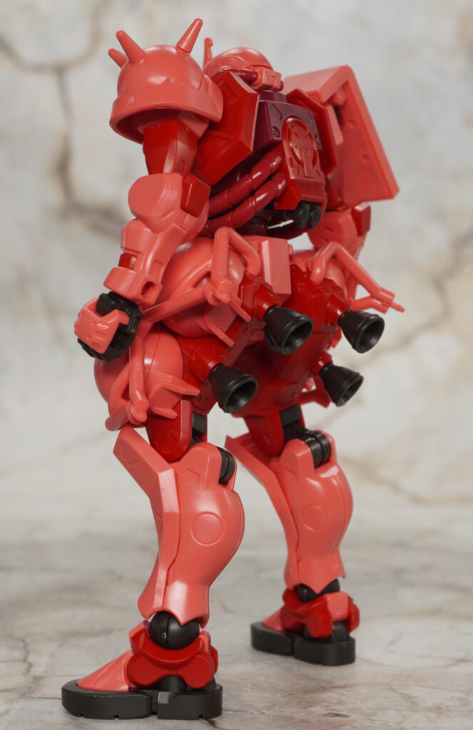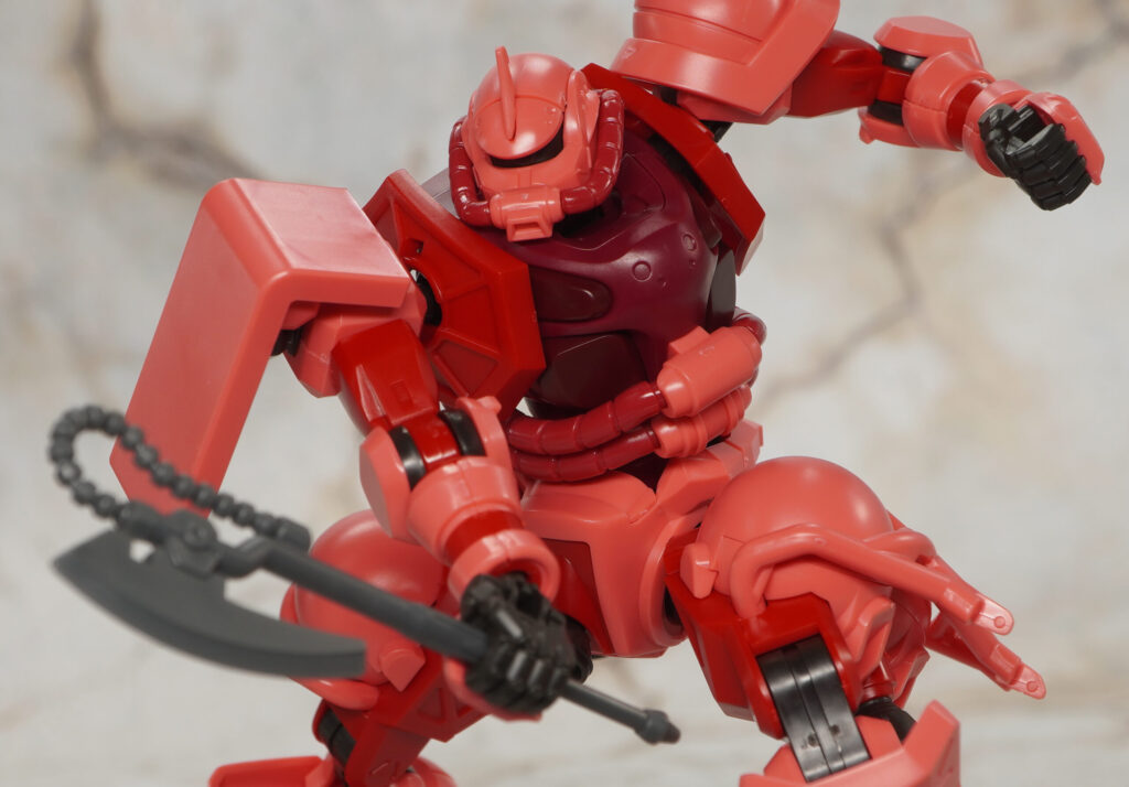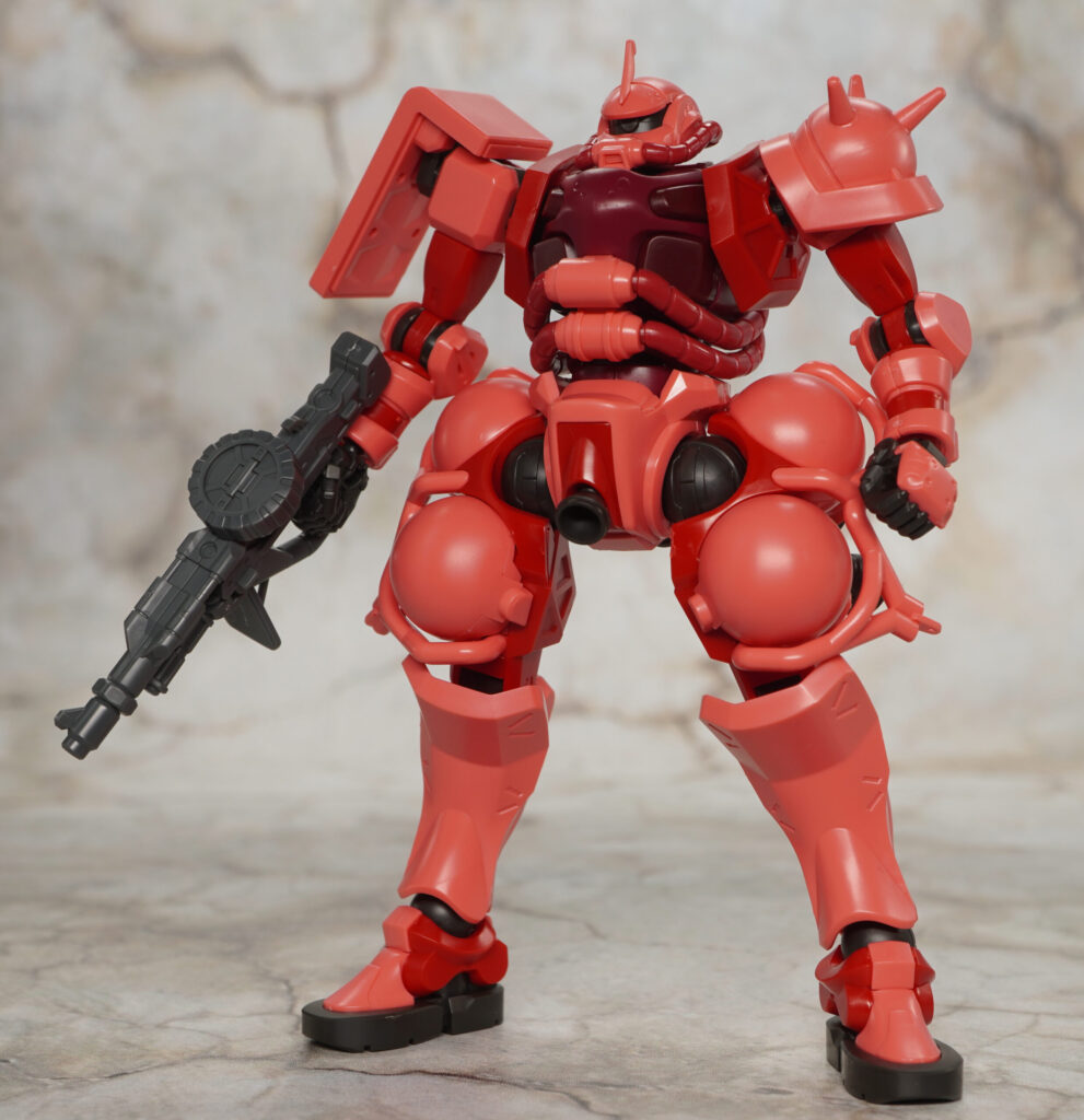 こちらが完成した【HGGQ】シャア専用ザク(GQ)です。「機動戦士Gundam GQuuuuuuX」に登場する初代ガンダムからデザインの一新されたジークアクス版のザク(GQ)で、シャア専用いうことで赤いカラーリングのMS-06S。