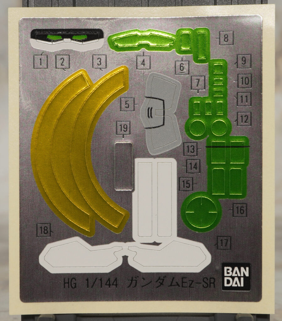 パッケージとシール。センサー類やヒザの白い部分、イントルーダーのアンテナなどを色分けするシールが付属。