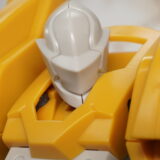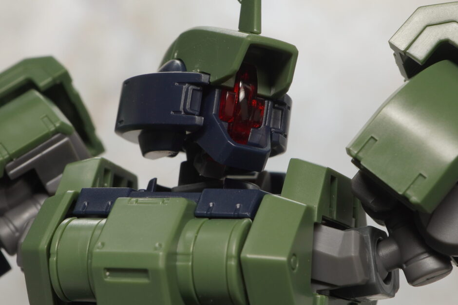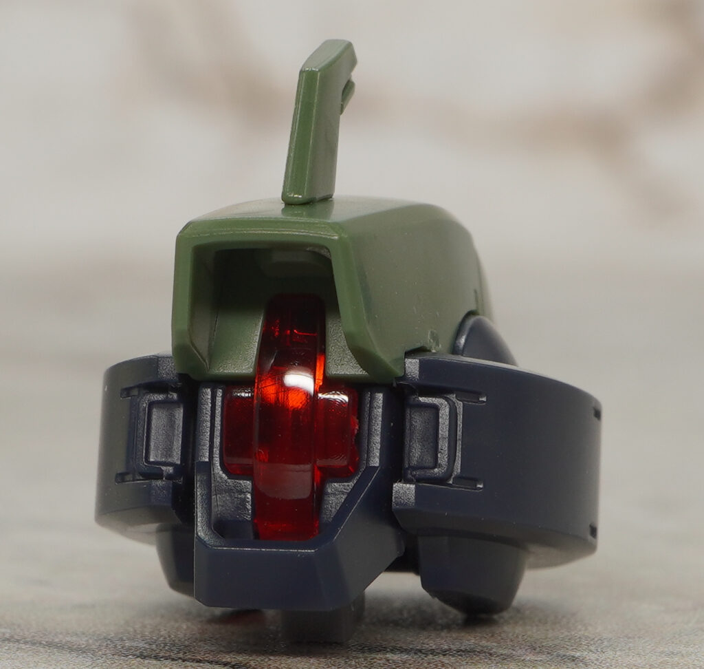 頭部の十字型のカメラアイはクリアレッドで造形されており、周辺はシールで色分け。