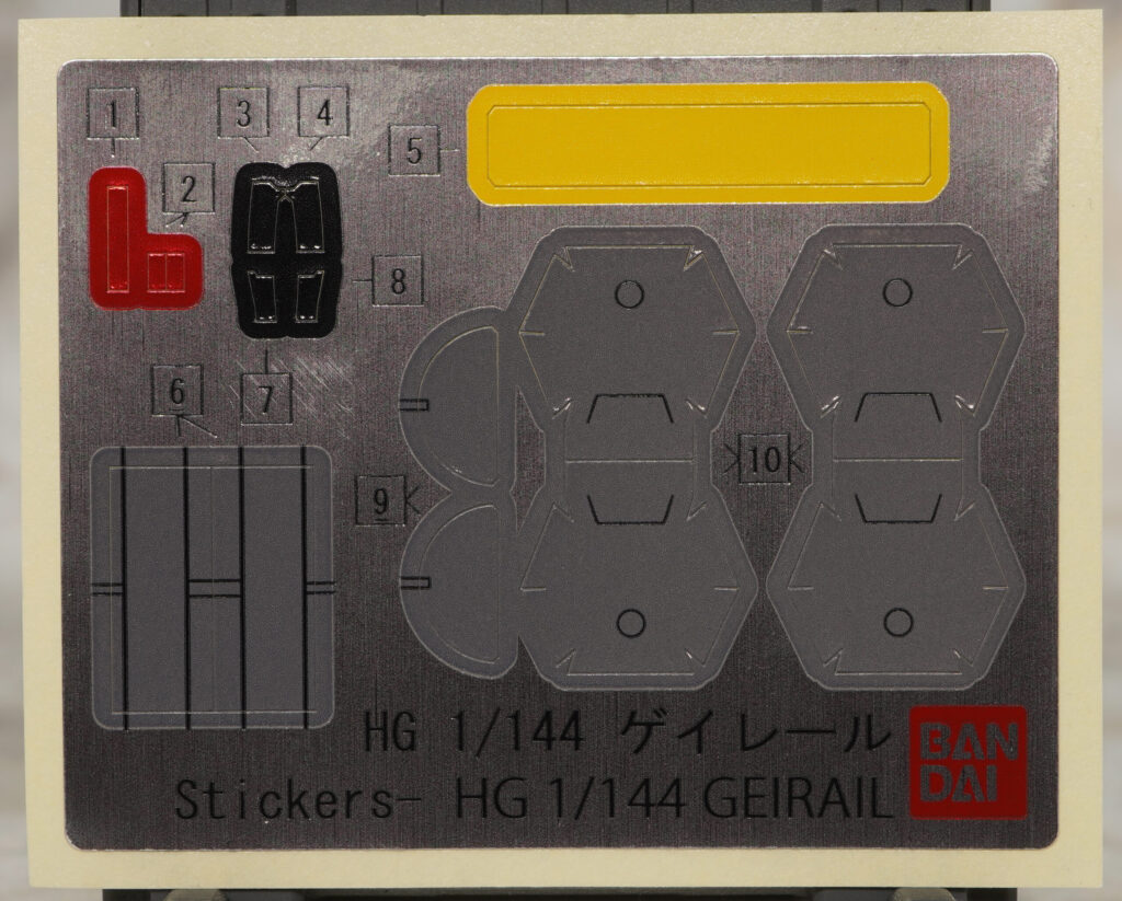 パッケージとシール。センサー類やエイハブリアクター、胸や足首などのグレーを色分けするシールが付属。