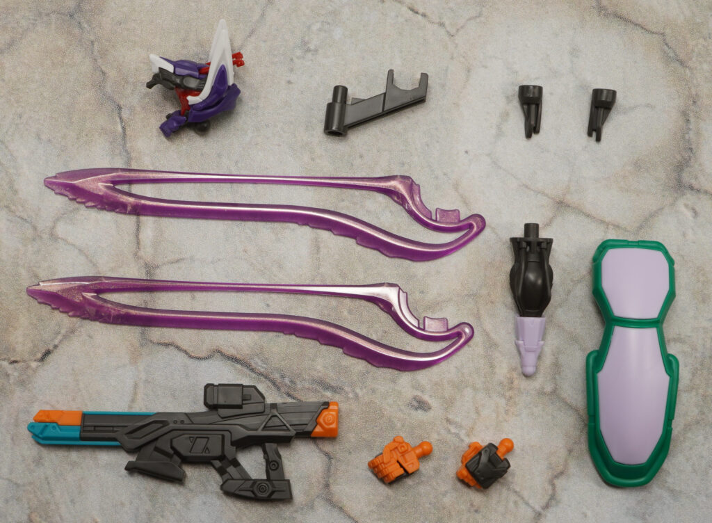 付属品はビームライフル、ビームサーベル×2、シールド、展開状態頭部、エスビット用ジョイント×2、ビームライフル用ジョイント、左右持ち手、コア・ファイター差し替えパーツです。