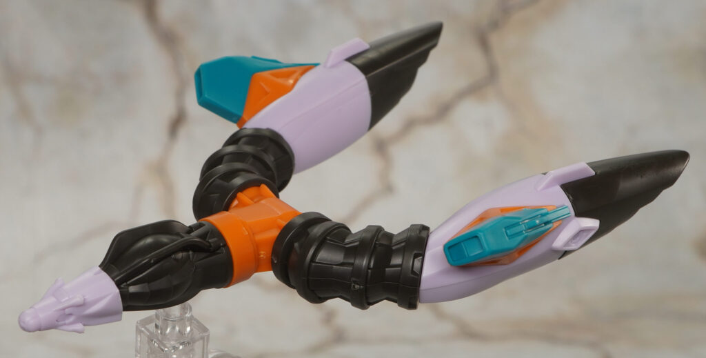 1号機のジークアクスをベースに形状の変わった頭部や肩、背部ブースター先端などが新規造形で再現され、紫や緑なんかの超絶複雑な機体カラーもメチャ細かくパーツ分割で再現されているぞ!