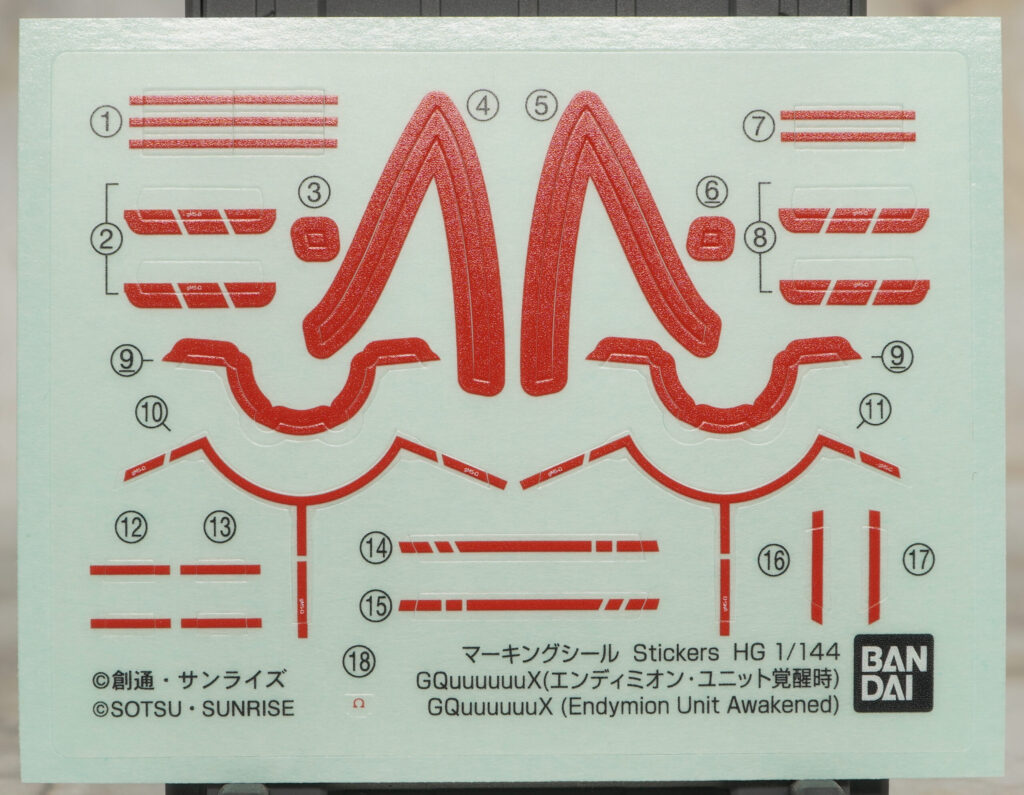 パッケージとシール。ツインアイや開いた口内などを色分けするホイルシールと各所の赤ラインを再現できるマーキングシールが付属。