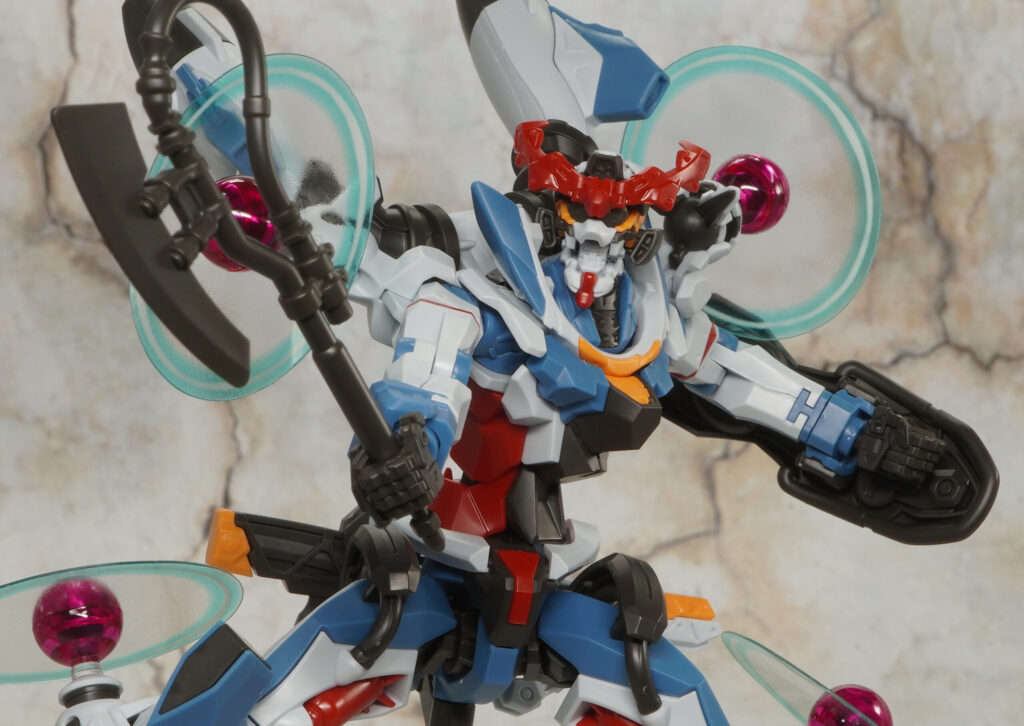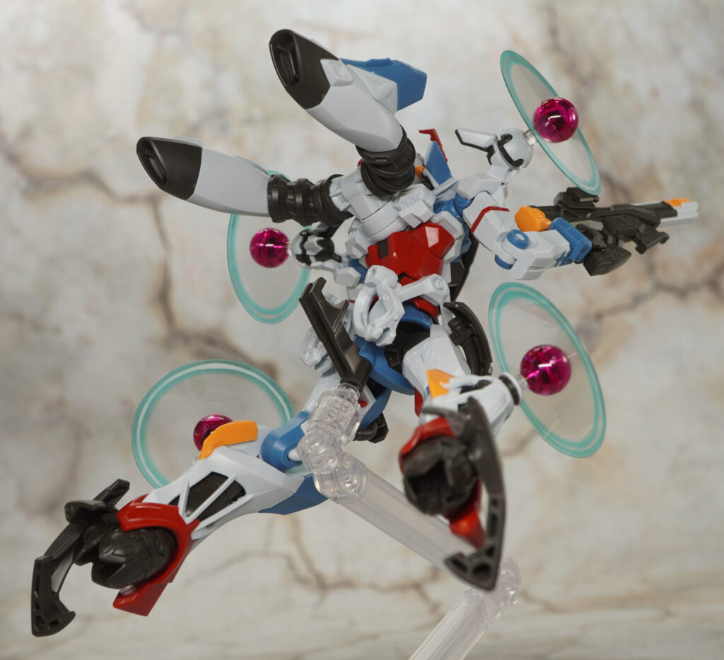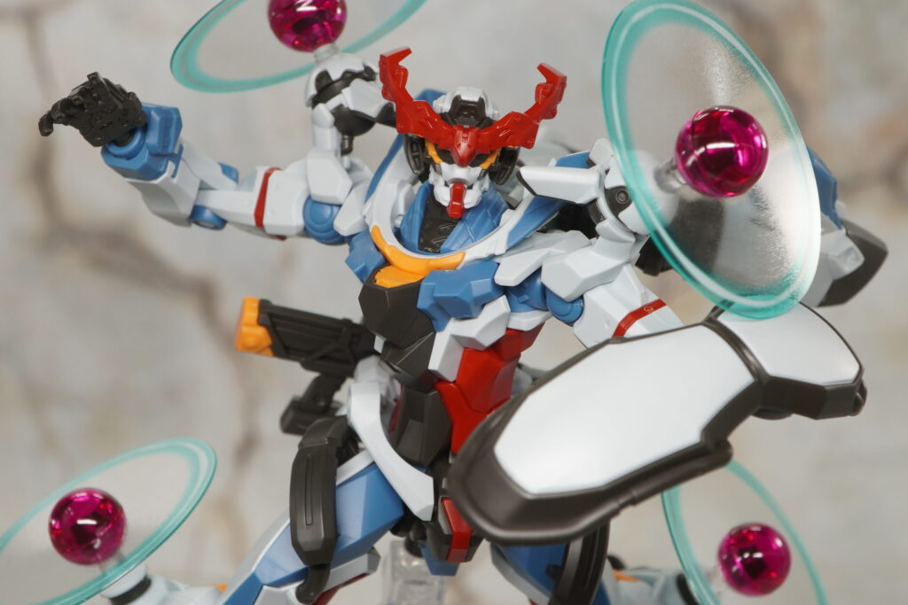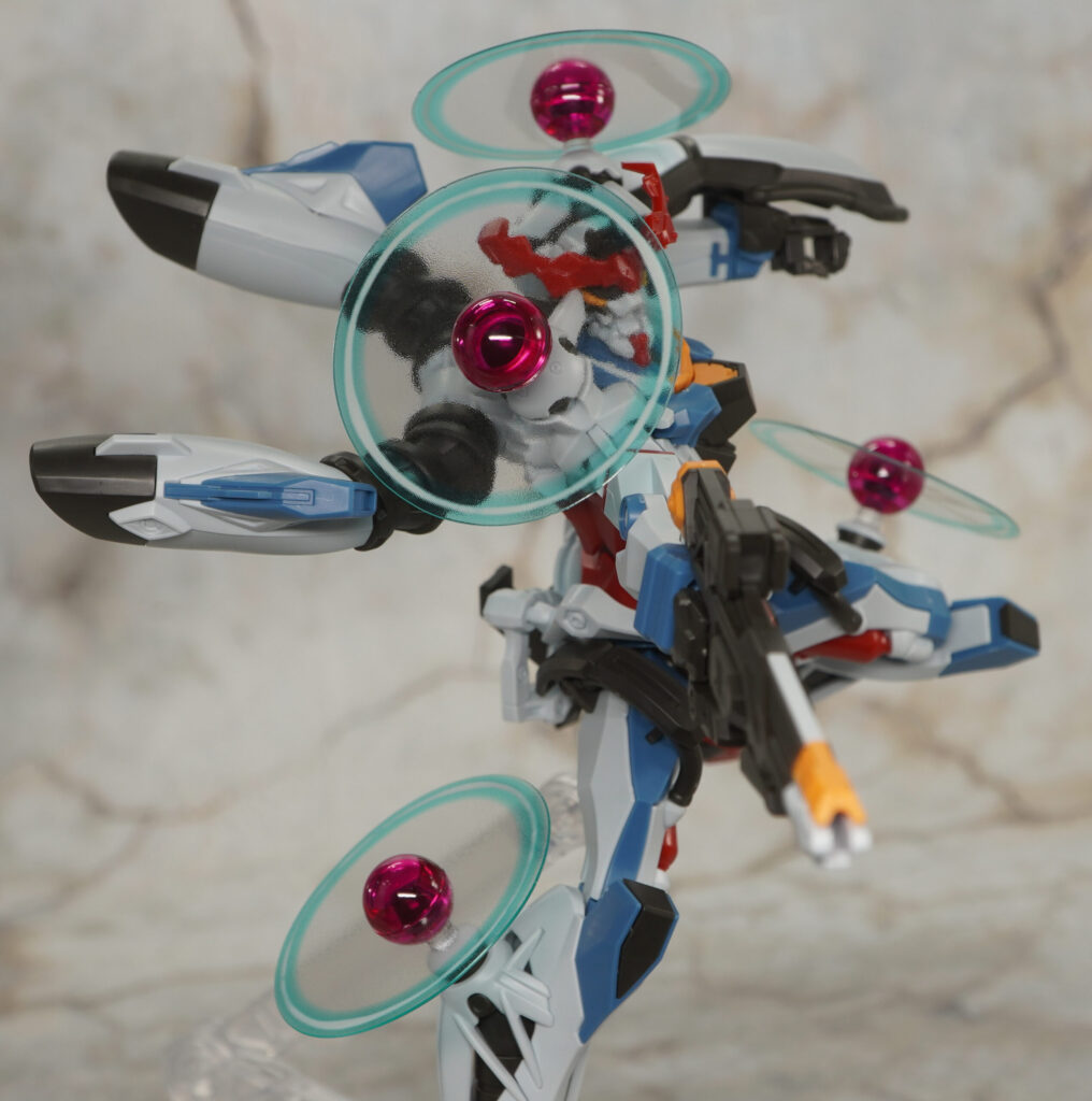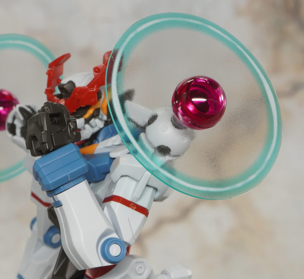 口が開閉可動する展開状態頭部やPETシート製の謎エフェクト、クリアパーツ製の謎球体エフェクト、ビーム・ライフルマウントジョイントが新規造形で再現されているぞ!