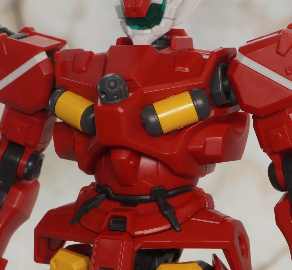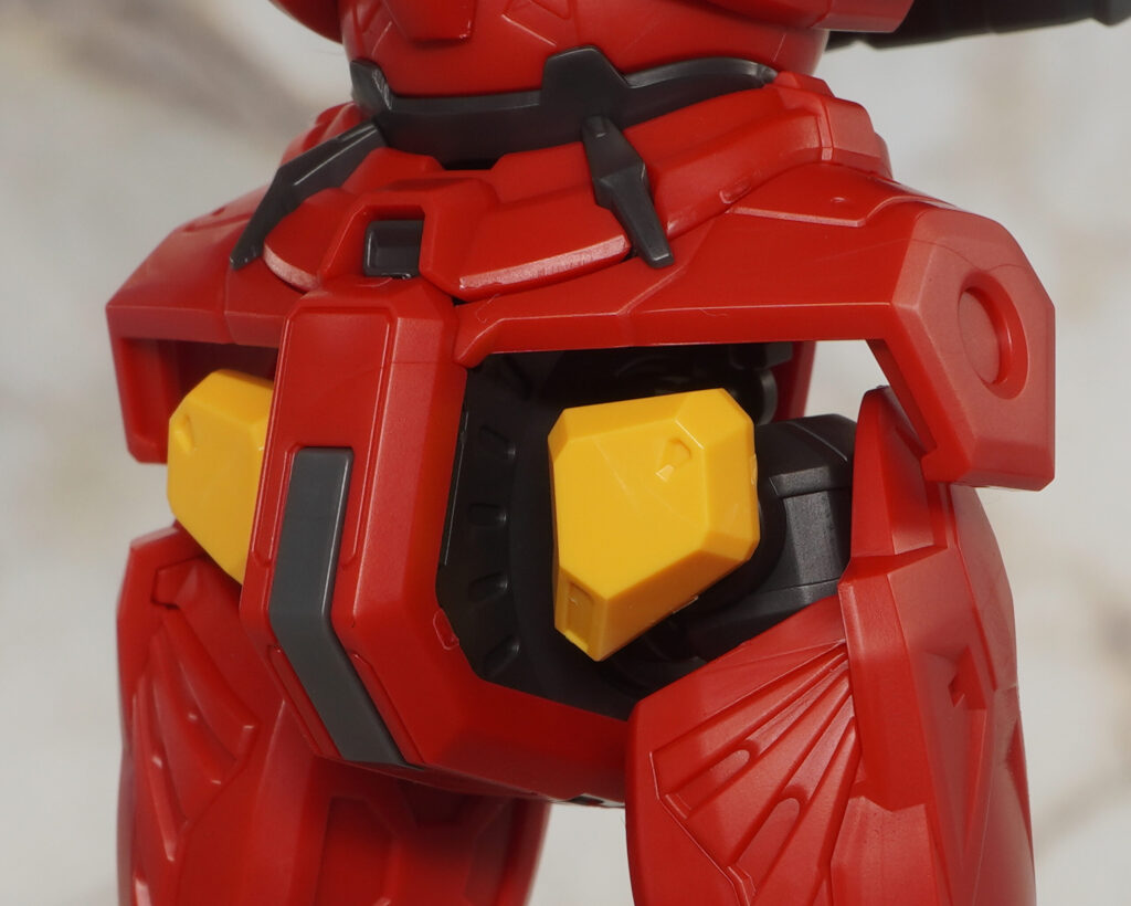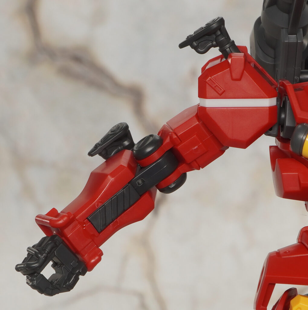 肩とヒジにある武装ジョイントは脱着可能で、赤いガンダムなどに付属する展開状態のパーツを流用可能。