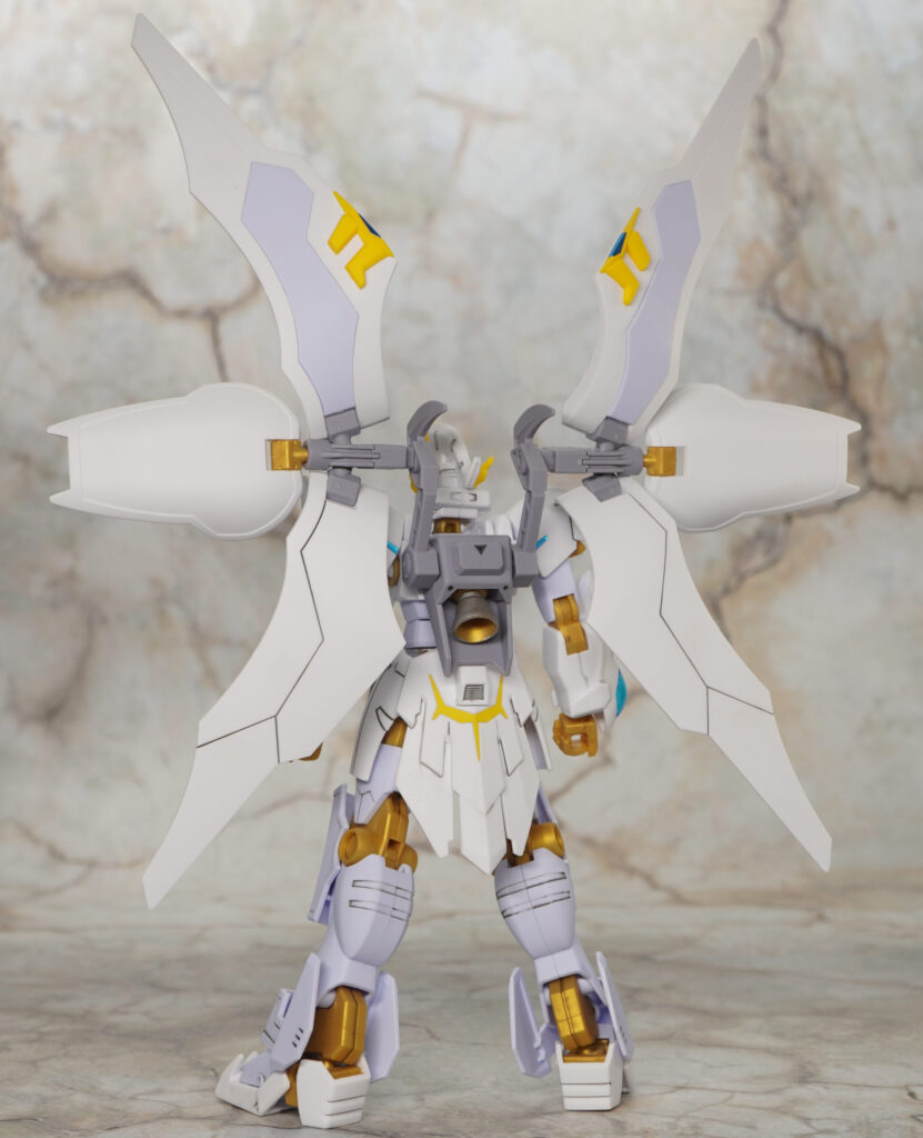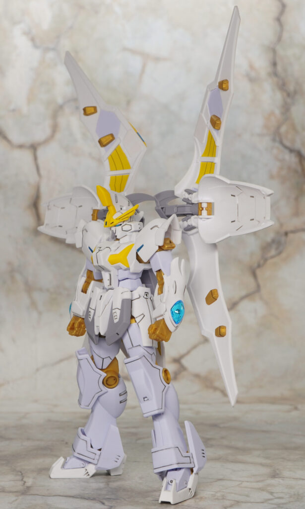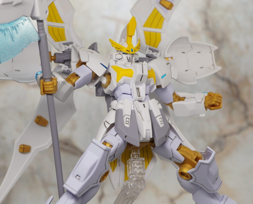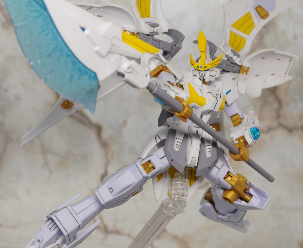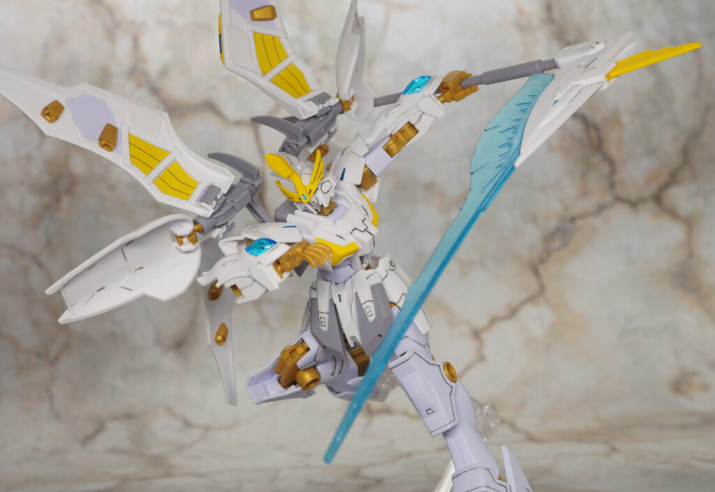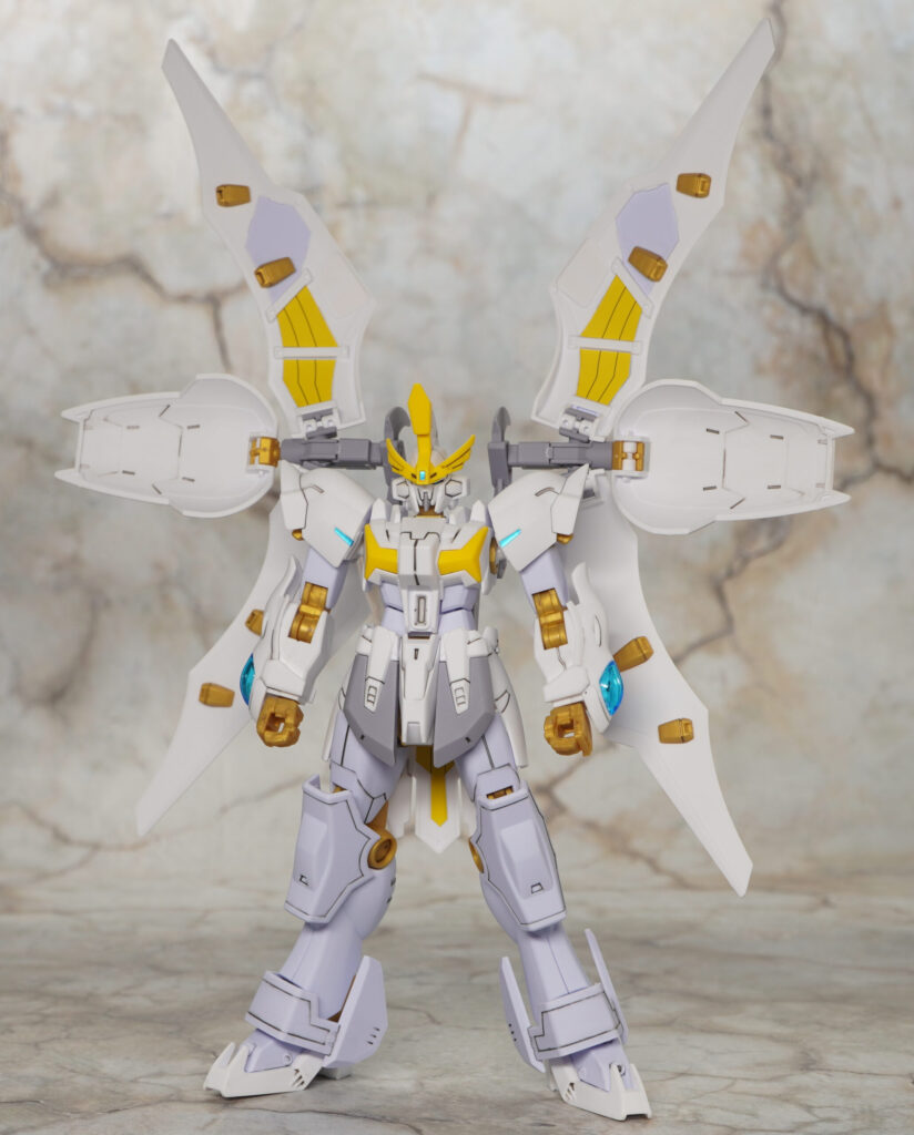 こちらが完成した【HGGBB】ガンダムリヴランスヘブンのアクティブクロークを閉じた状態。「ガンダムブレイカー バトローグ」に登場するアイゼン・トウマがビルドした、ベースキットであるガンダムデスサイズヘルの死神とは逆に天使をモチーフにしたというガンプラ。