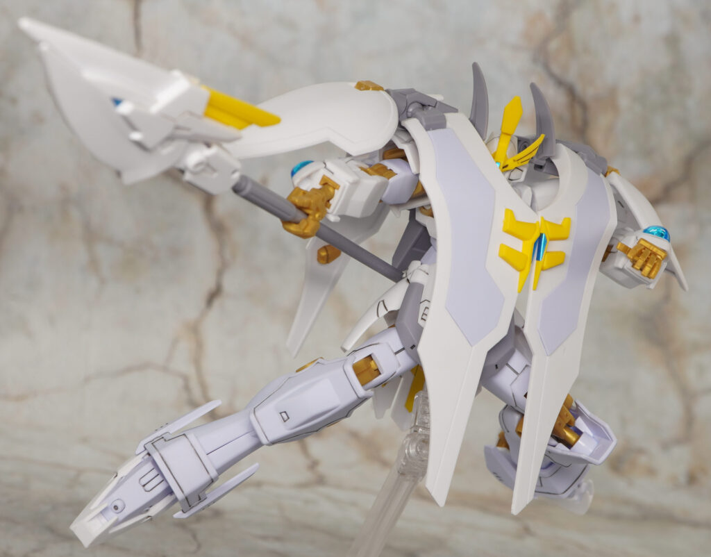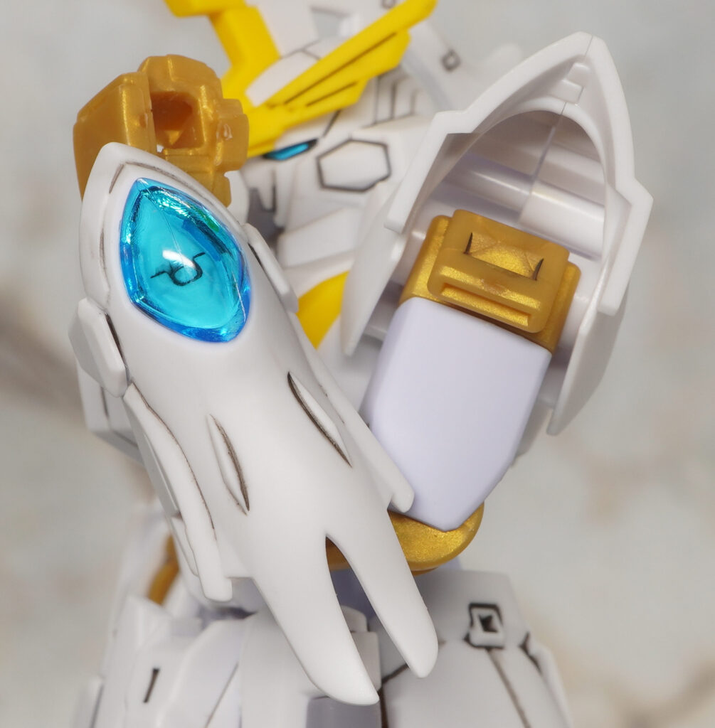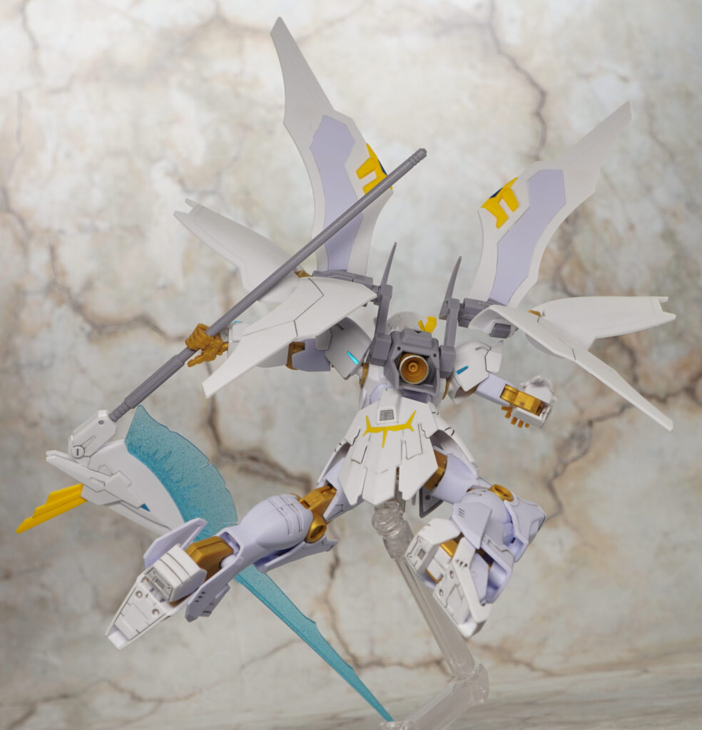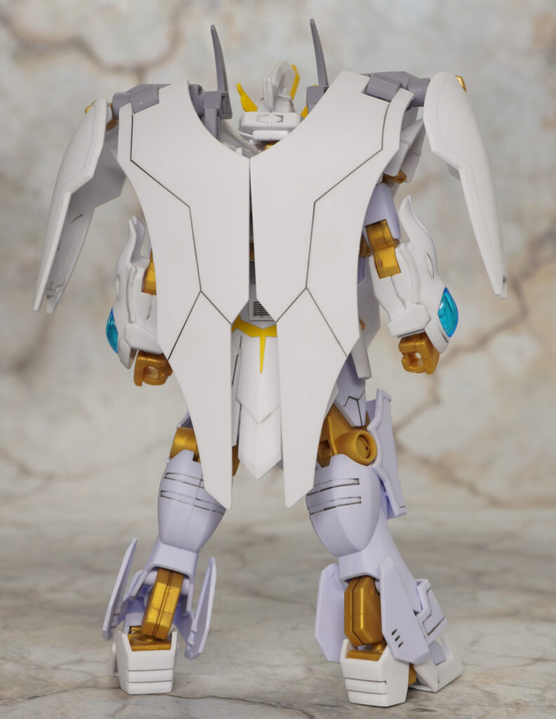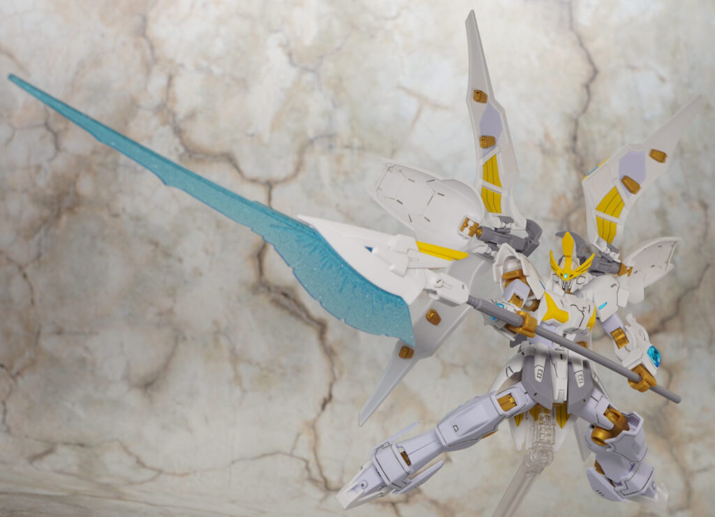 こちらが完成した【HGGBB】ガンダムリヴランスヘブンのアクティブクロークを閉じた状態。「ガンダムブレイカー バトローグ」に登場するアイゼン・トウマがビルドした、ベースキットであるガンダムデスサイズヘルの死神とは逆に天使をモチーフにしたというガンプラ。