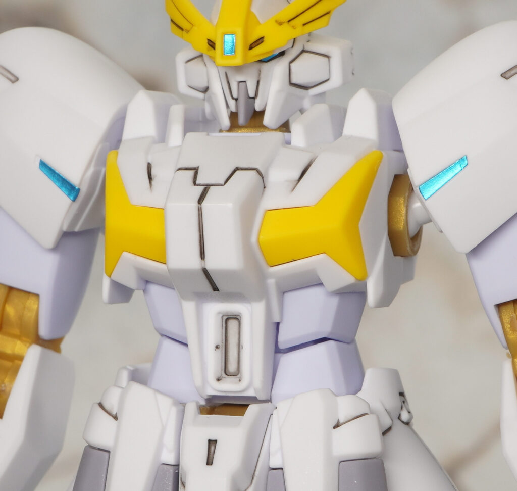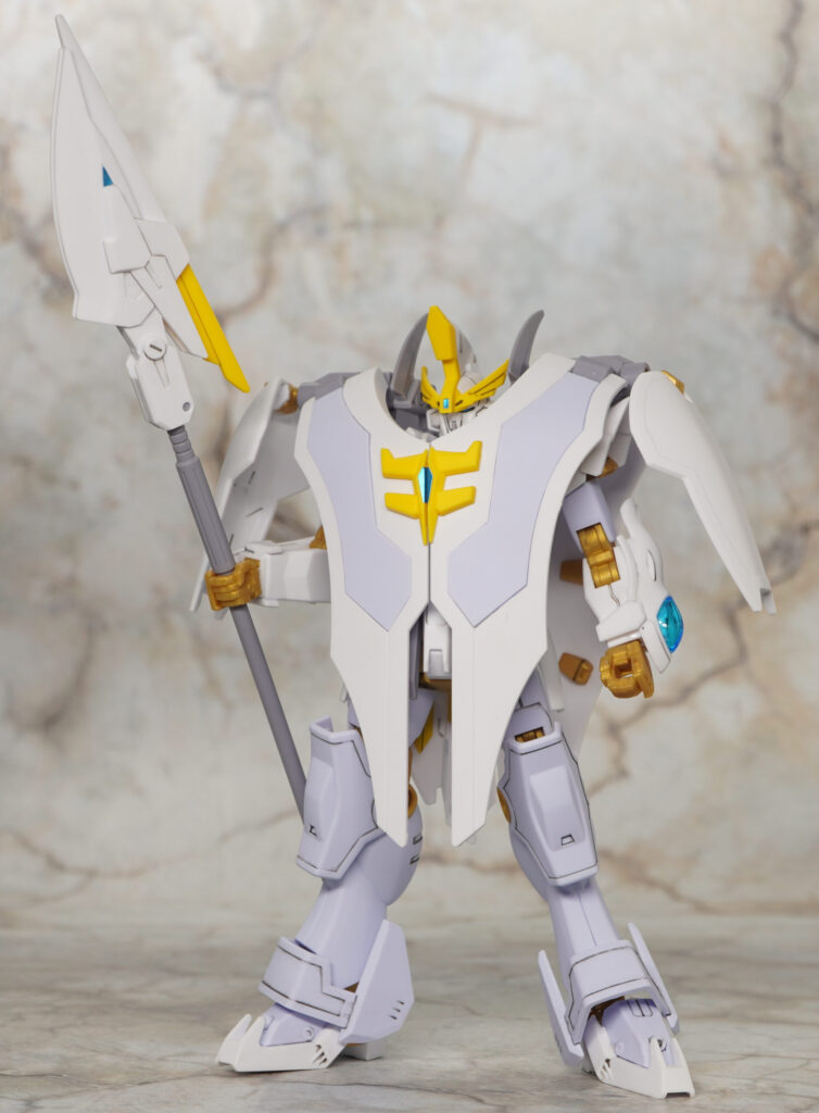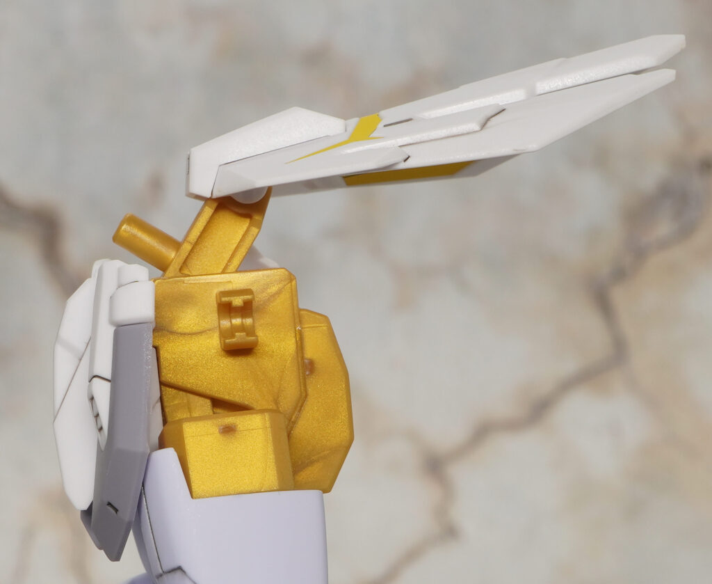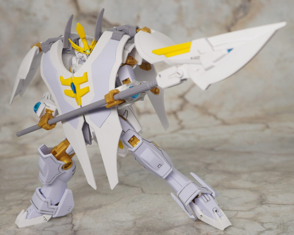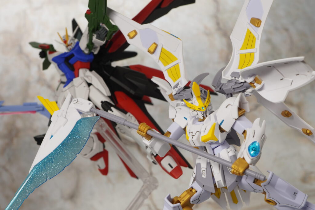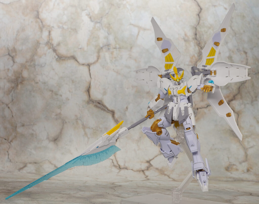 こちらが完成した【HGGBB】ガンダムリヴランスヘブンのアクティブクロークを閉じた状態。「ガンダムブレイカー バトローグ」に登場するアイゼン・トウマがビルドした、ベースキットであるガンダムデスサイズヘルの死神とは逆に天使をモチーフにしたというガンプラ。
