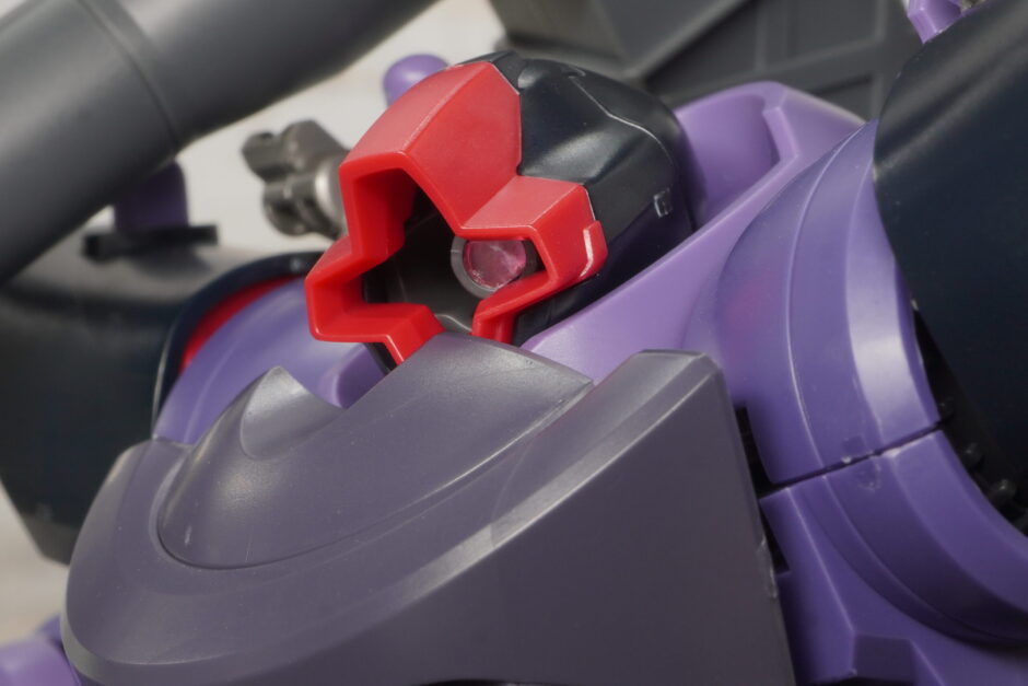 頭部は正史ドムと同じ様な形状ですが物凄い小顔で、モノアイがピンク色のパーツで造形されておりボール軸で上下左右に可動。