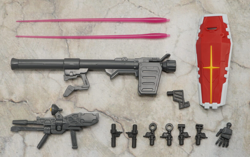 付属品はビーム・ライフル、ビーム・サーベル×2、シールド、ハイパー・バズーカ、左平手、ビット懸架パーツ一式です。