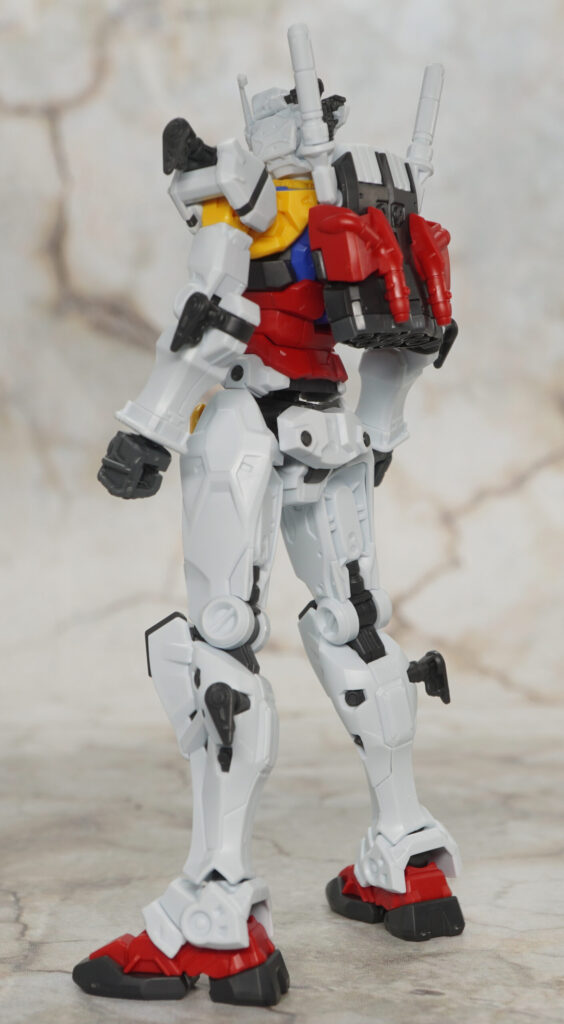 白いガンダムいうことで特徴的な青白赤黄のトリコロールカラーが再現されており、大きな部分はパーツ分割で色分けされてますが細かい部分はシールや塗装が必要。