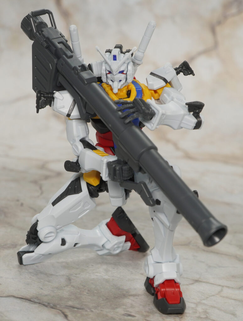 以前HG化された赤いガンダムがベースですが、ビットやガンダムハンマーの代わりにハイパー・バズーカが付属するのと、頭部側面の形状が異なるとガンダムが言っている。