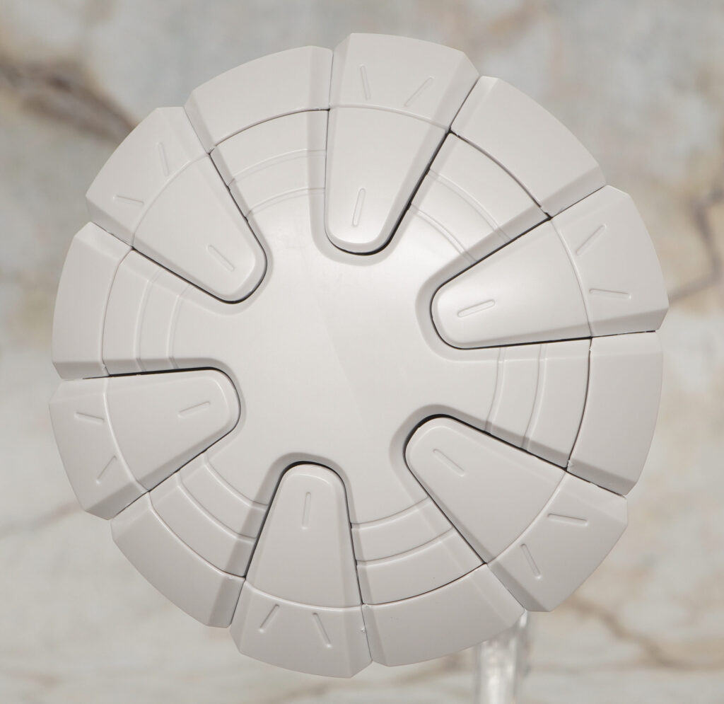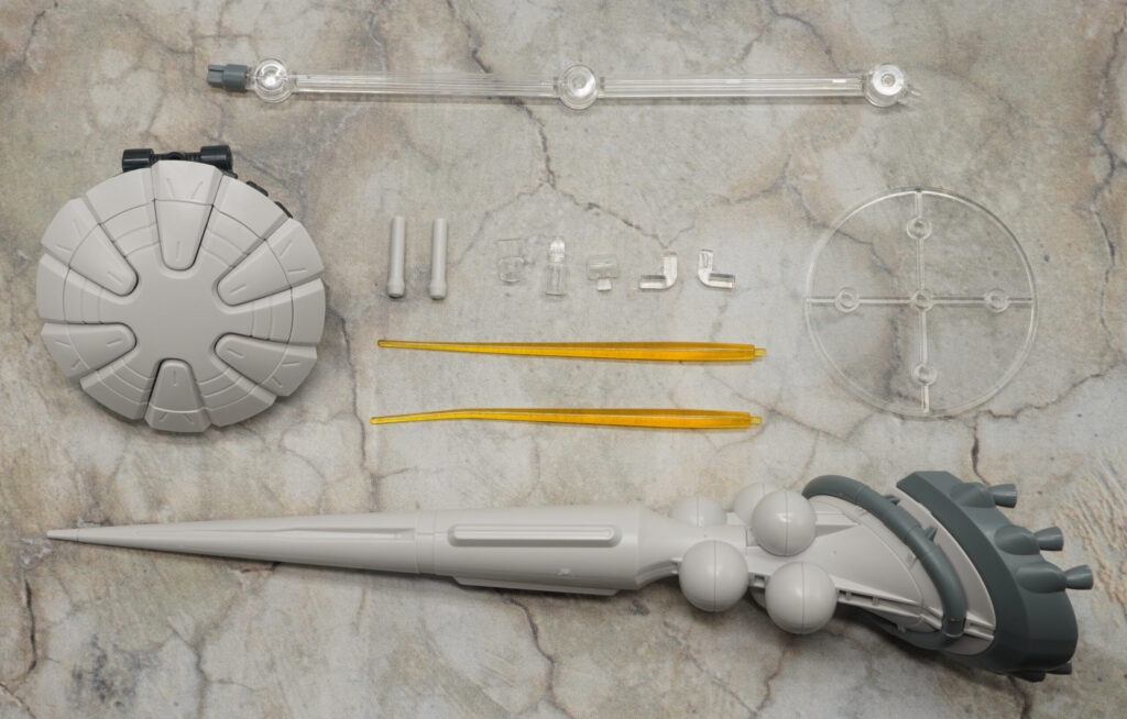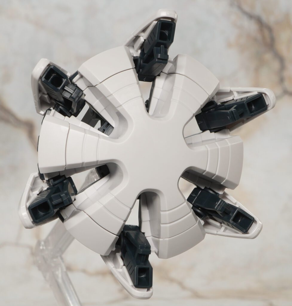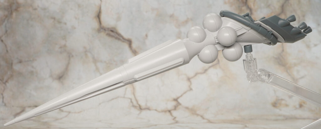 小さいバーニア類は別パーツで造形されており、ハクジ本体は簡易展示ベースを使ってディスプレイできます。