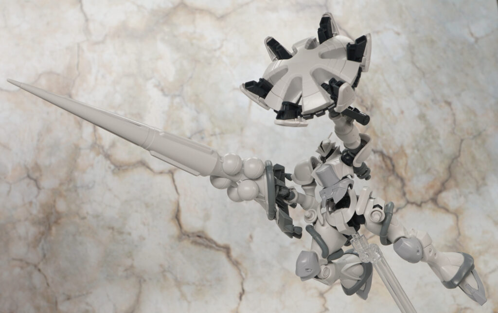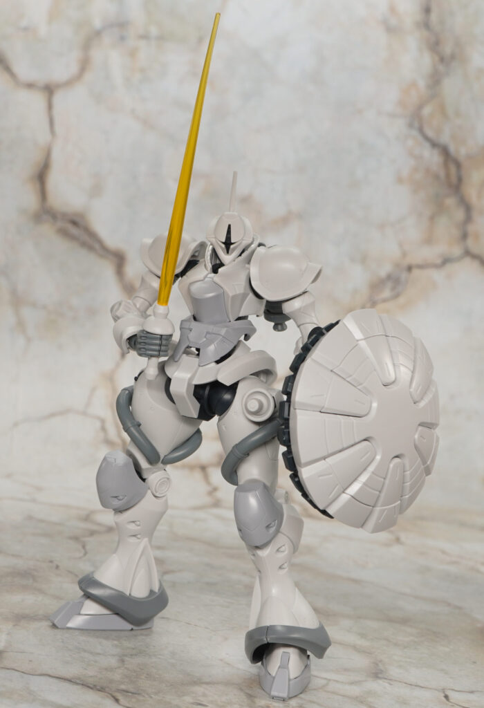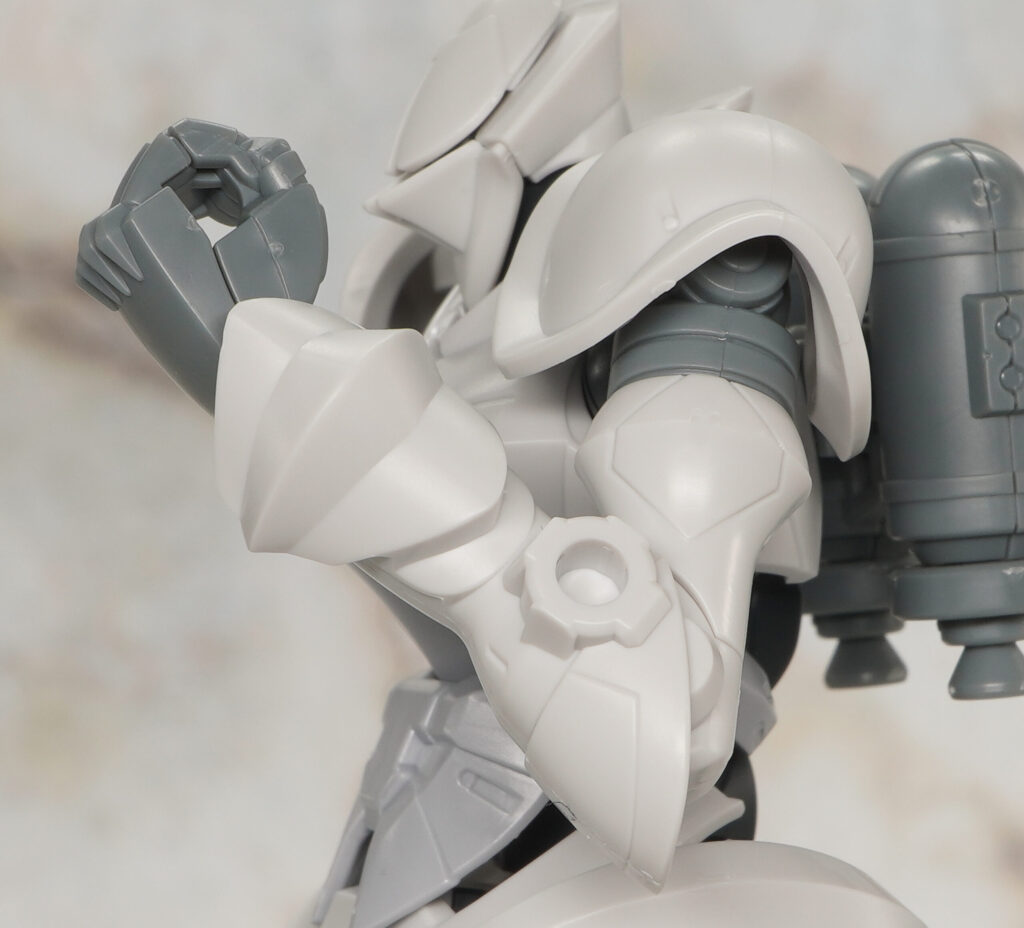 肩アーマーはボール軸接続で、手首関節はスナップ可動しサーベルの突きポーズを採れる構造。