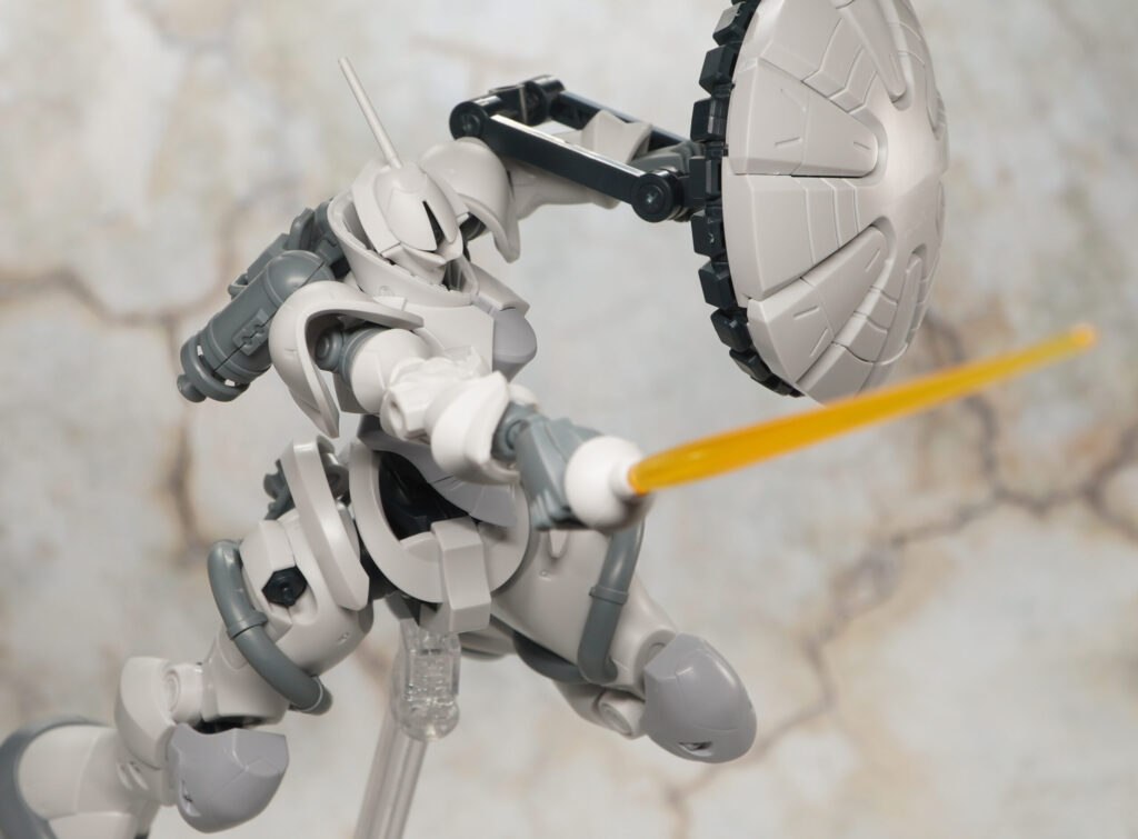 モノアイを動かしたり太ももに装備しているビーム・サーベルを脱着できるぞ!