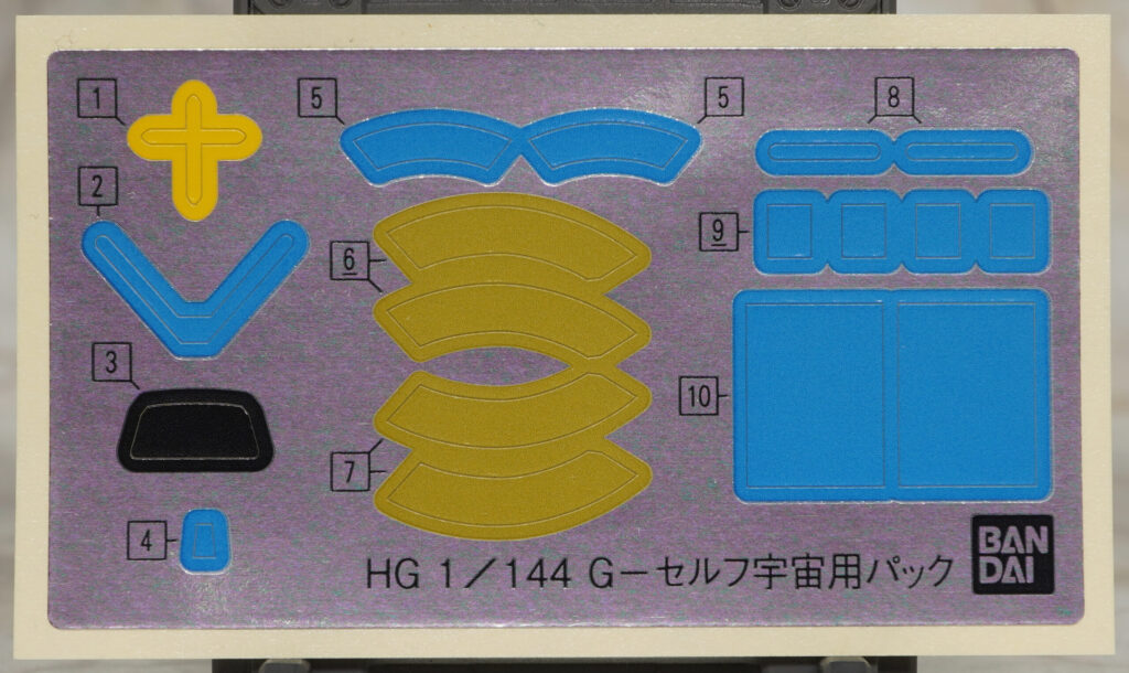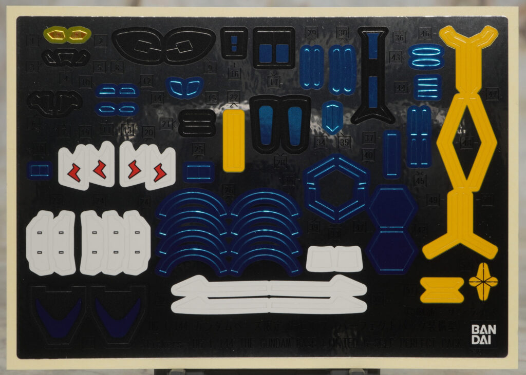 シールはガンダムベース限定のパーフェクトパック装備型に付属していた極薄で隠蔽力の高いネーマーシール、ツインアイなどの発光部に使えるプラスチックシール、通常版の宇宙用パックに付属していたホイルシールの計3種類が付属。