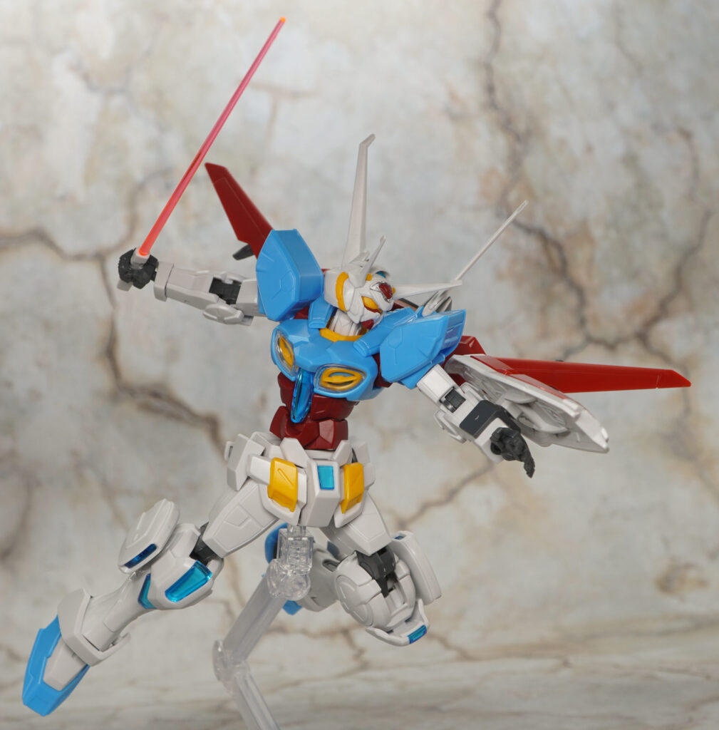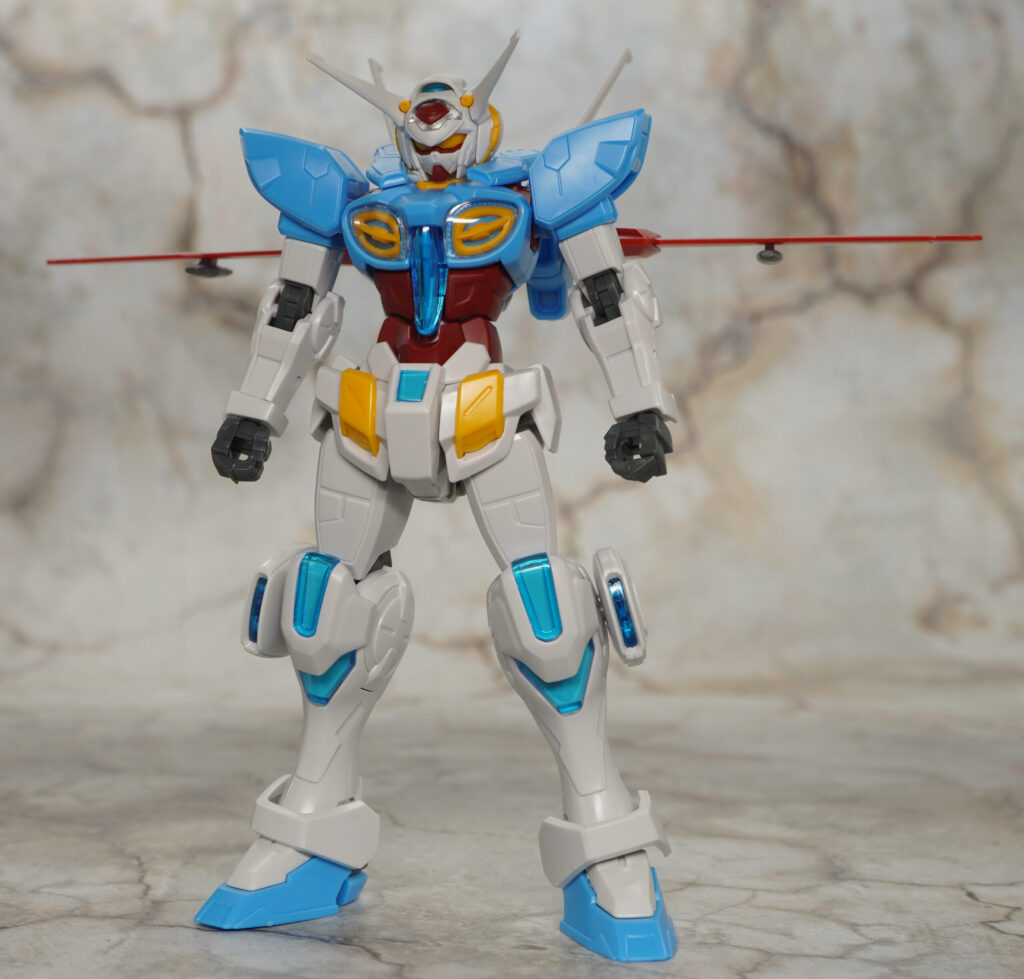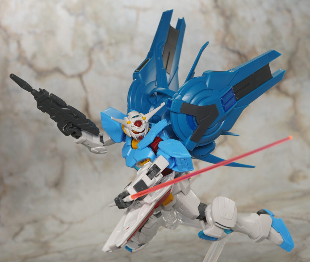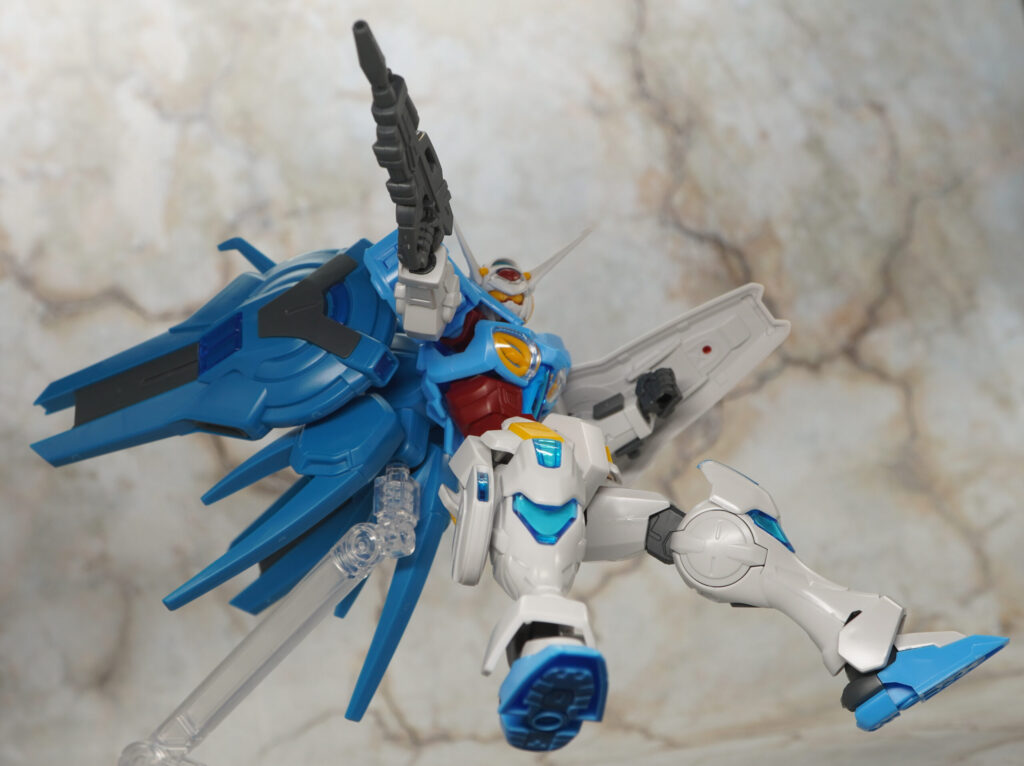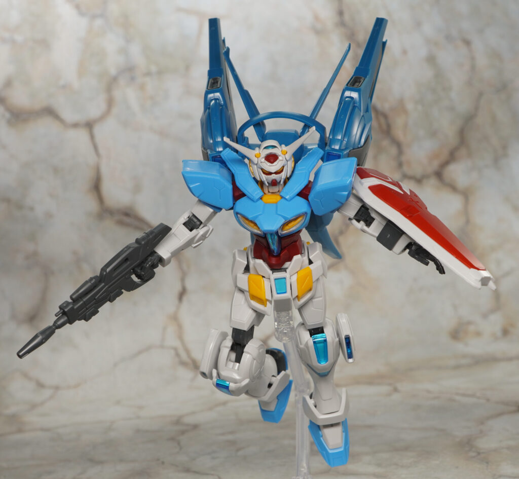 こちらが完成した【HG Gレコ】G-セルフ(大気圏用パック&宇宙用パック)(劇場版『Gのレコンギスタ』Ver.)です。「ガンダム Gのレコンギスタ」に登場する主人公機で独裁者アナザーベリルやラララライが乗ってた作中最強機体。