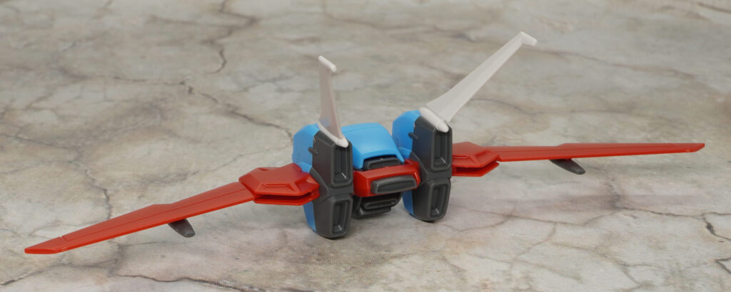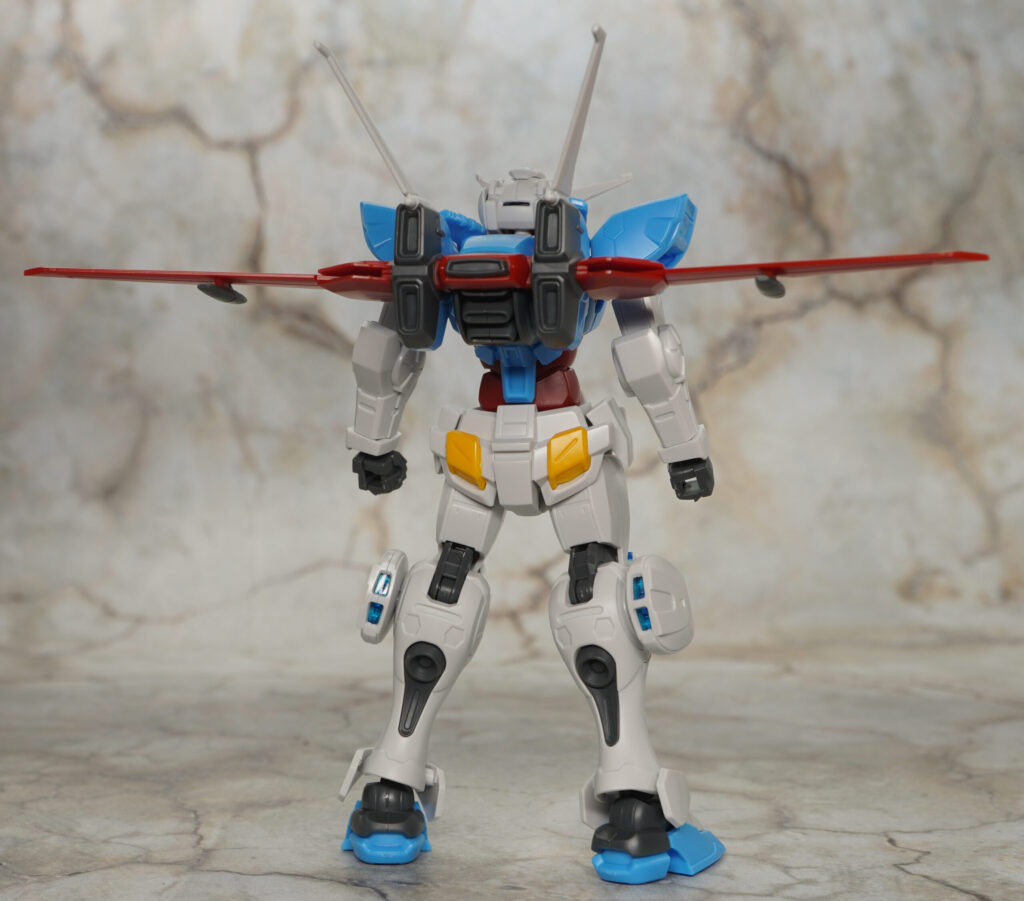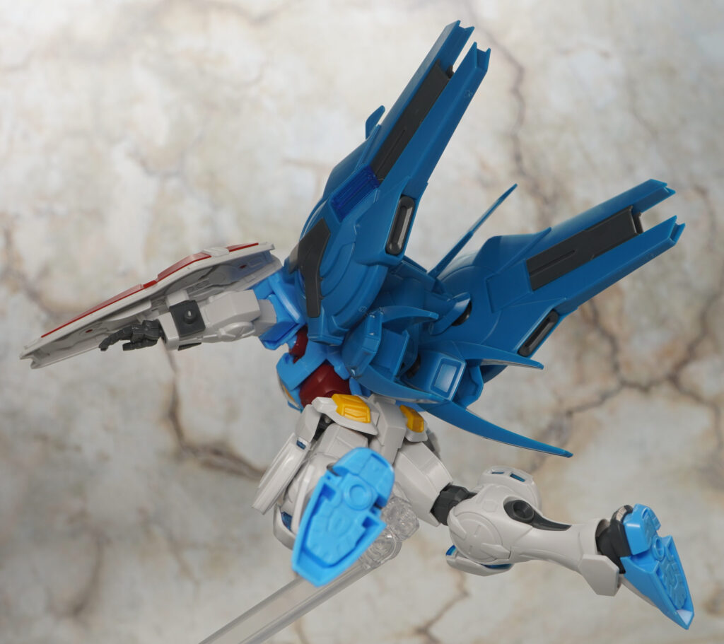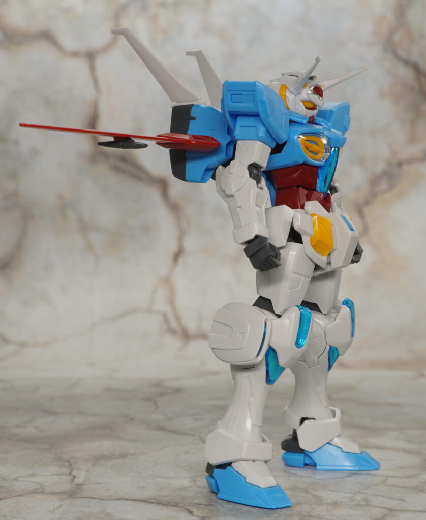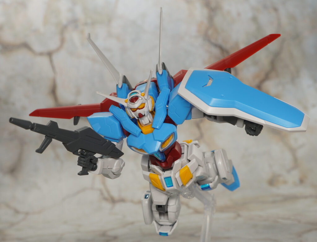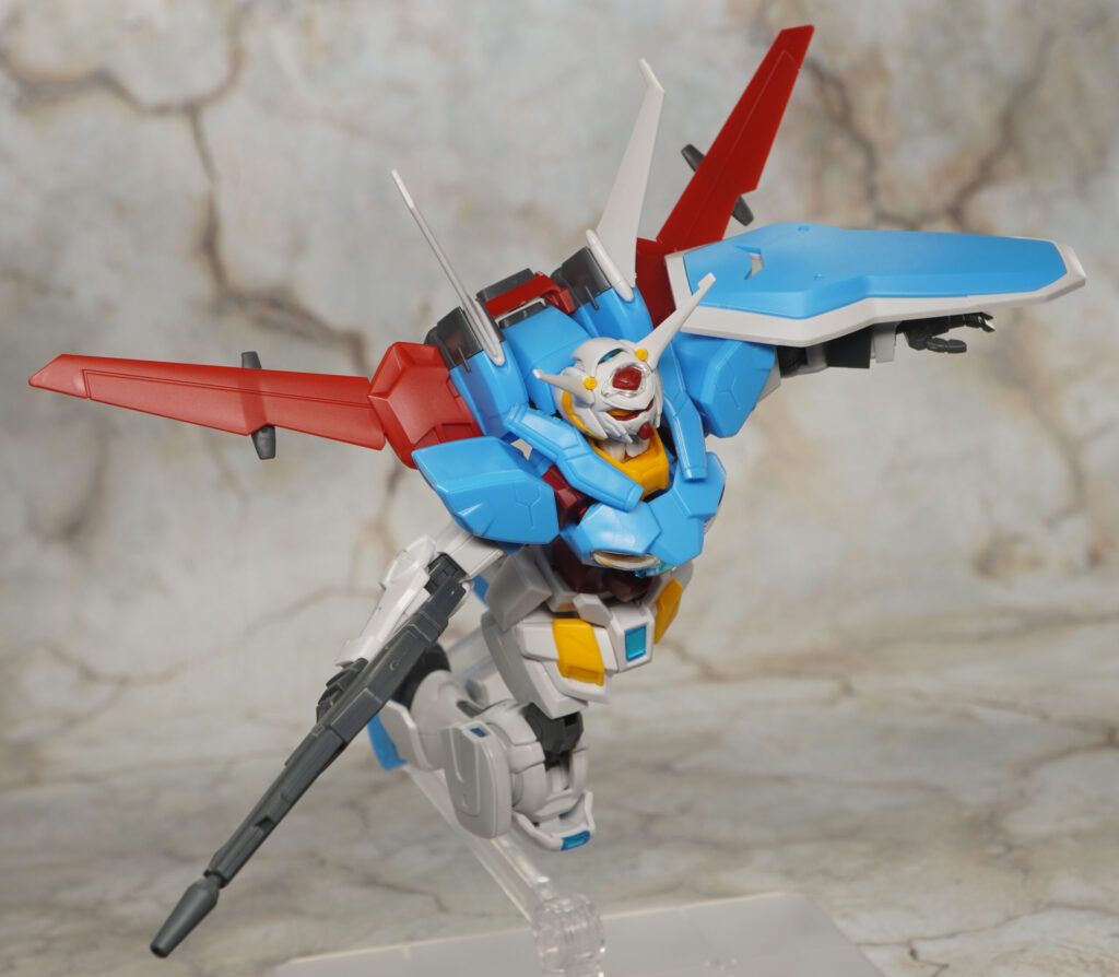 こちらは大気圏用パックを装備してシールは全く貼ってない状態ですが、通常版と比べて頭部の色分けが向上してたり、胴体の胸インテークにはクリアパーツが追加されたりしてて素組みでもメチャ見栄えの良い仕上がり。