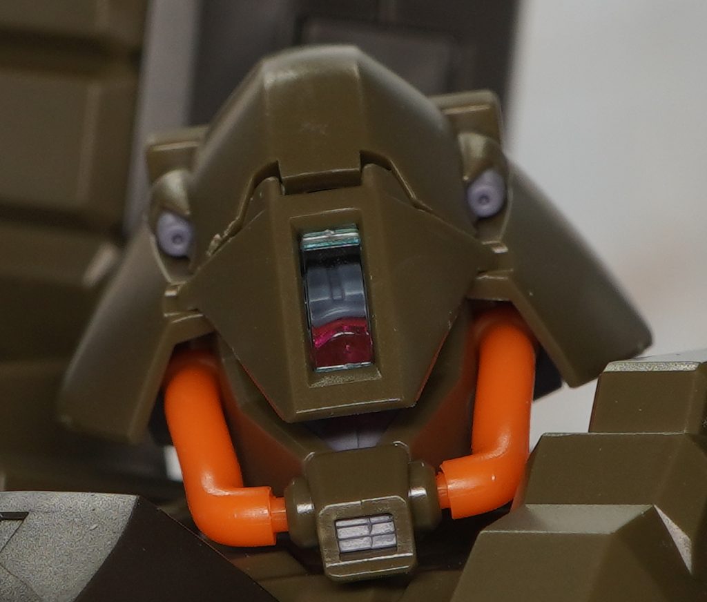 頭部のバルカンは別パーツで造形され、額はクリアブルー、モノアイはクリアピンクで再現。