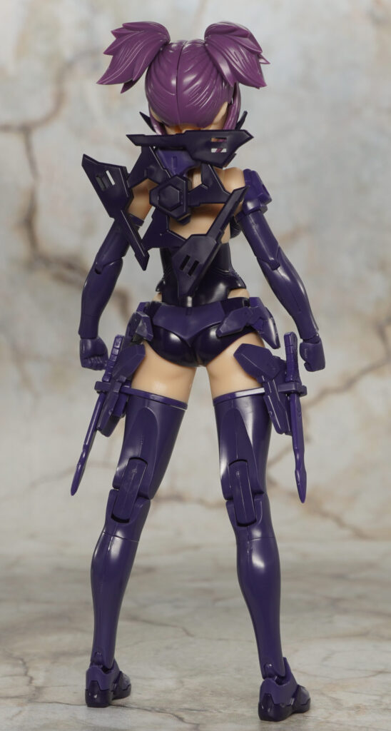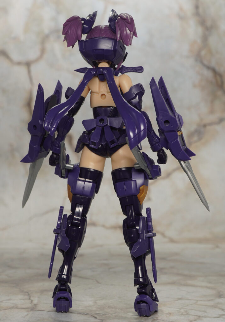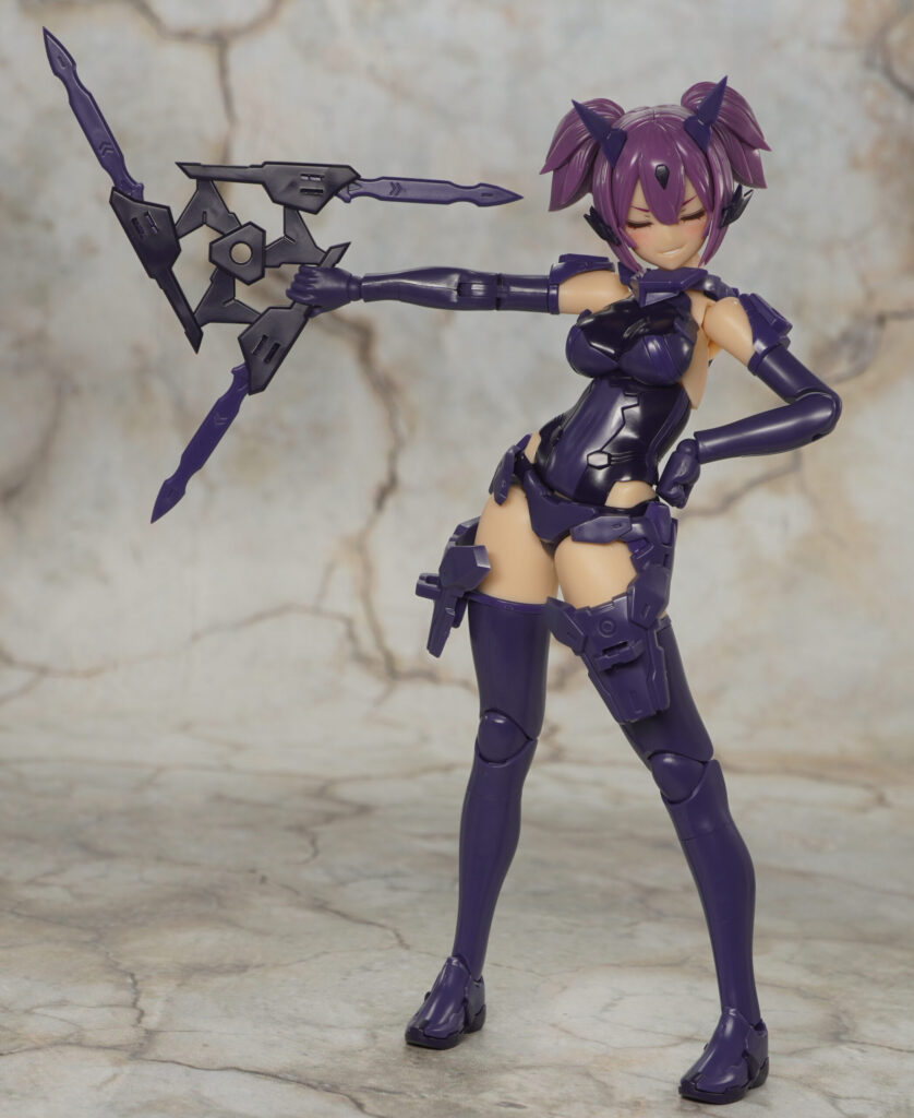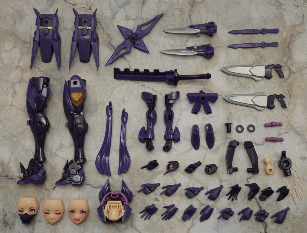 付属品は表情パーツ×4種、ハンドパーツ一式(素体用×7種、武装用×5種)、カスタム素体アーマー一式、手裏剣、クナイ×2、忍者刀、カタール×2、風魔、無銘×4、FAガール対応首関節、展示ベースです。
