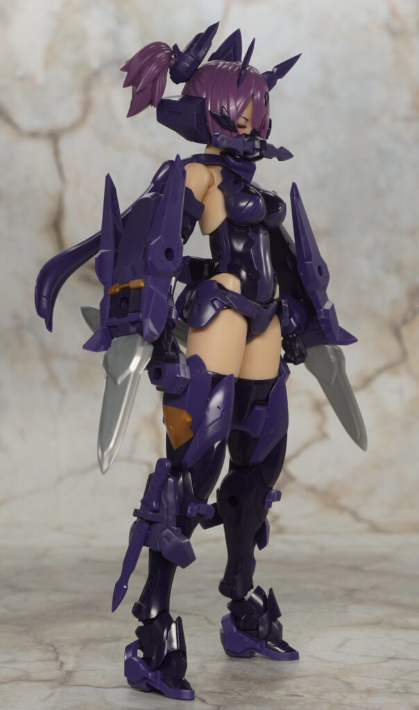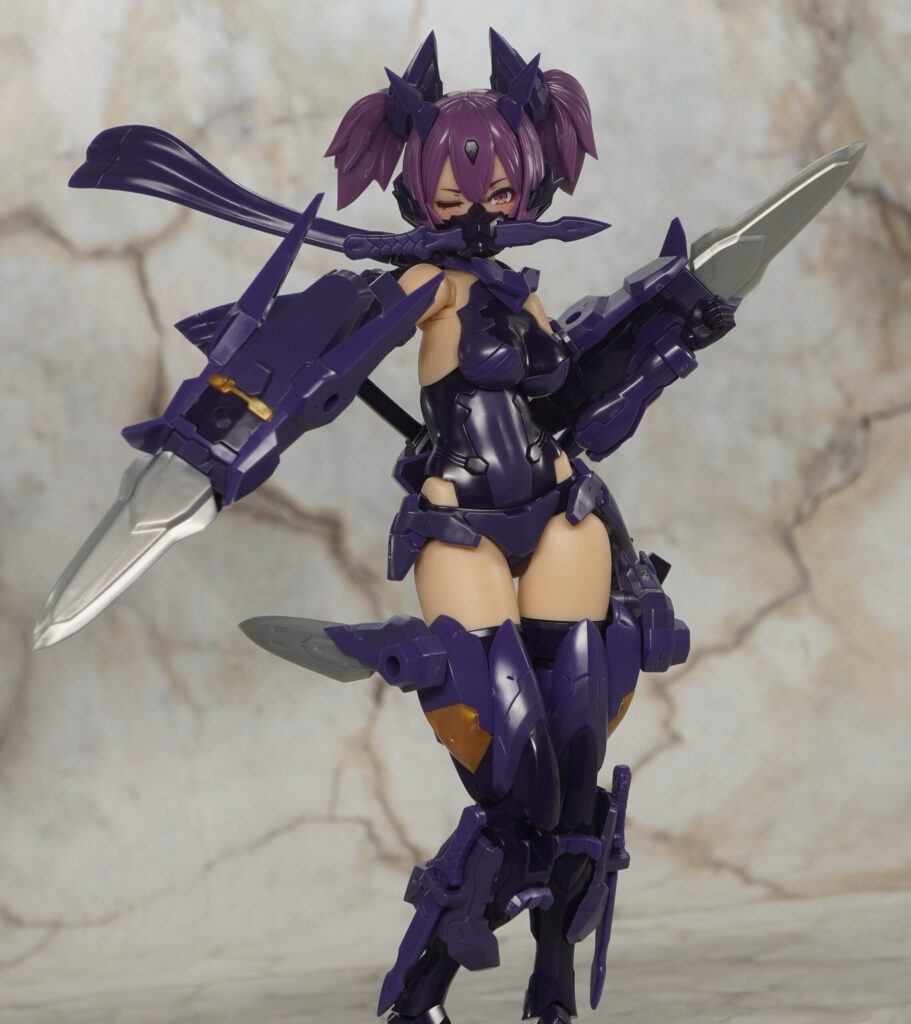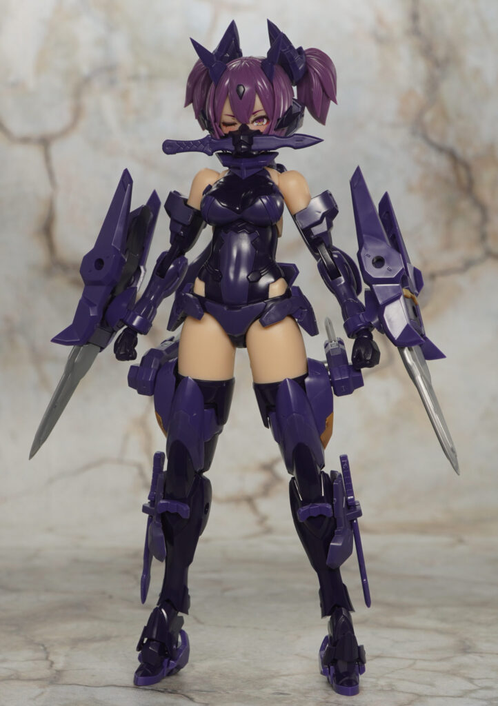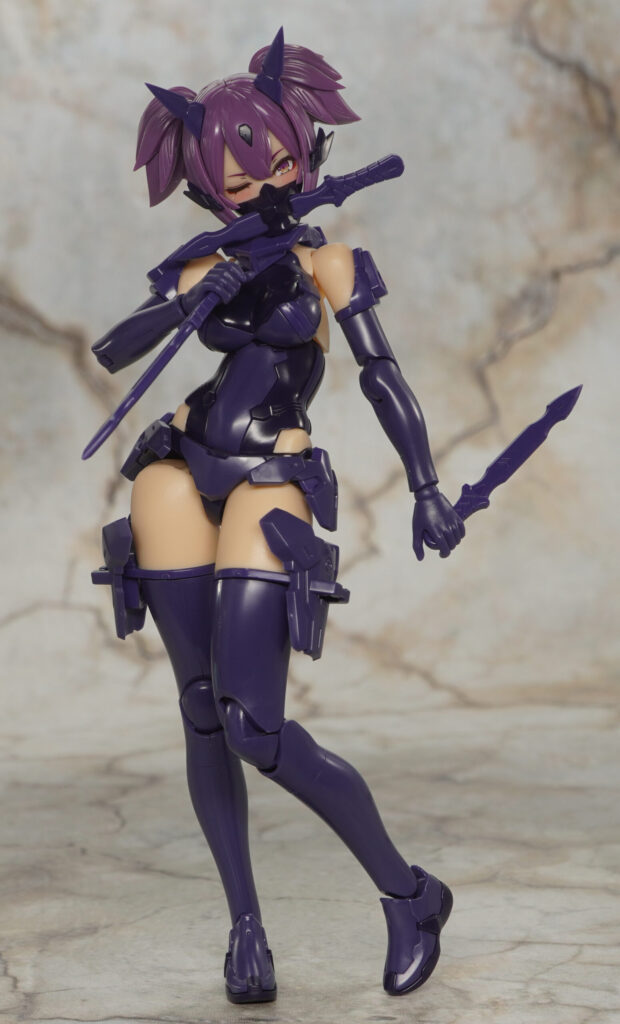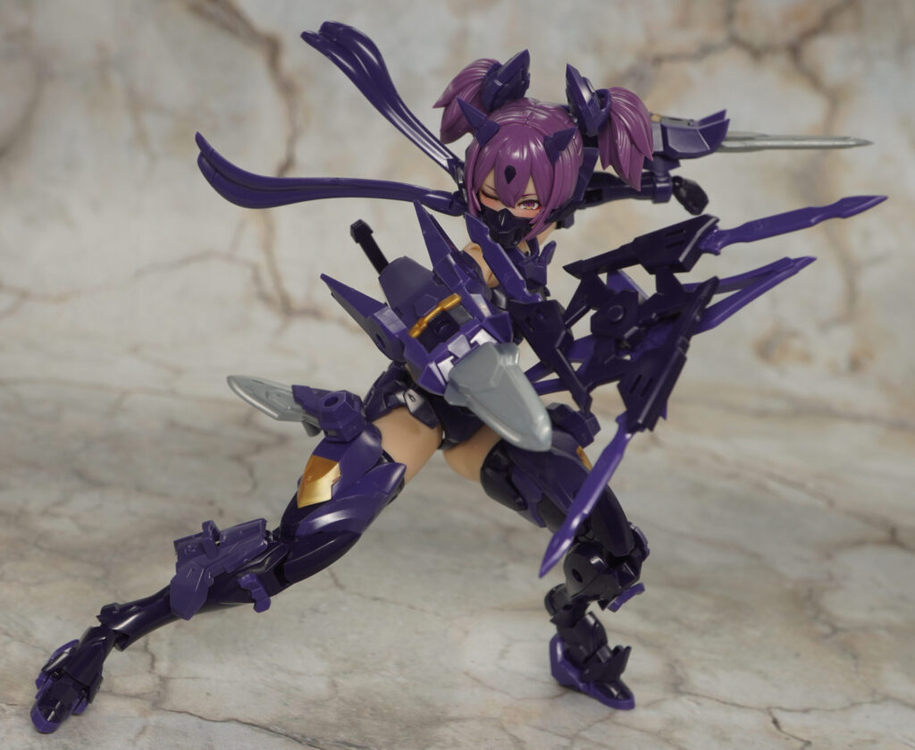 こちらが完成した【メガミデバイス】朱羅 忍者 枢 影衣 フルパッケージの武装モードです。朱羅シリーズ”忍者”のカスタムバリエーション機で、”マシニーカBlock1.5L”素体が採用されやや長身でグラマラスなプロポーションの枢(かなめ)。