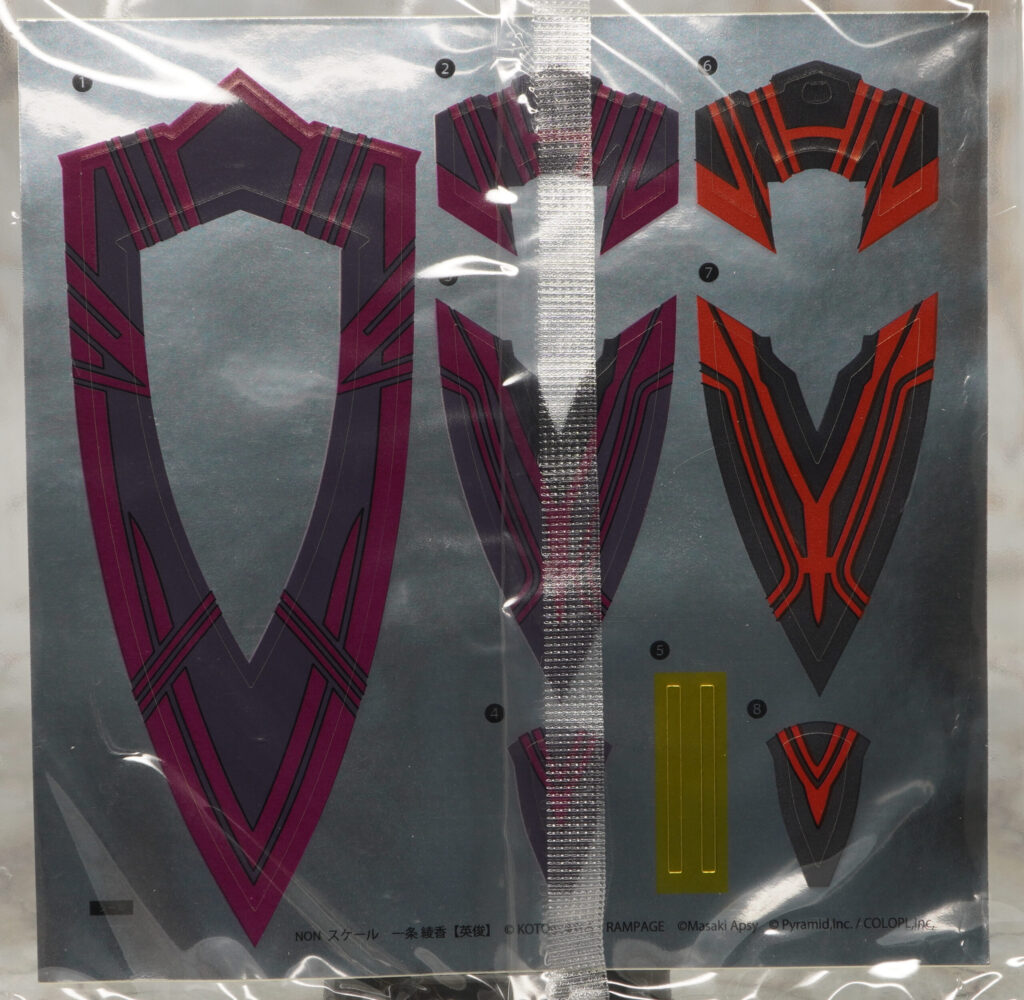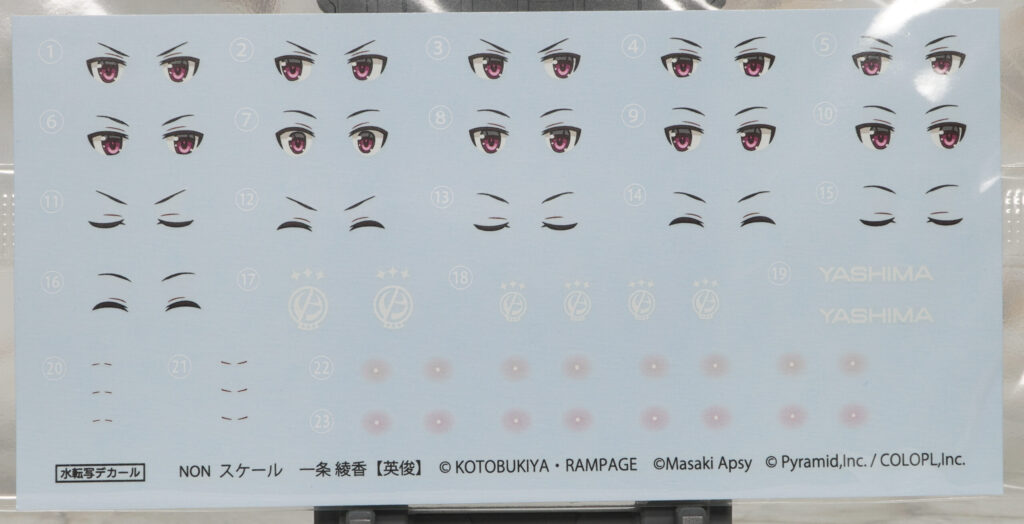 パッケージと水転写デカール。表情やマーキングを再現できるデカールとシールドを色分けするホイルシールが付属。