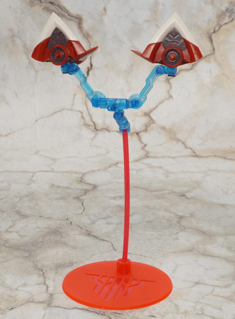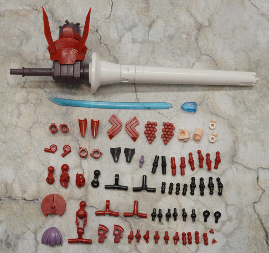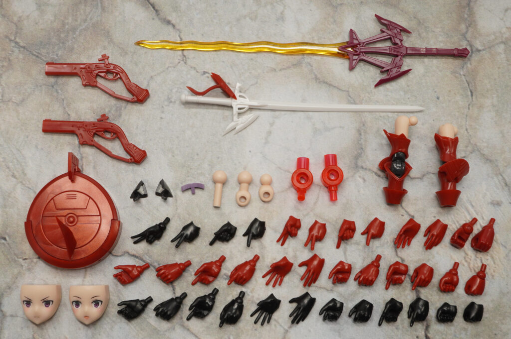 付属品は表情パーツ×3種、ハンドパーツ(素体モード用)×9種、ハンドパーツ(武装モード用)×10種、ギア一式、クロスギア、シールド、ショットギア×2、SPギア一式、お掃除ロボ、各種首関節、展示ベースです。