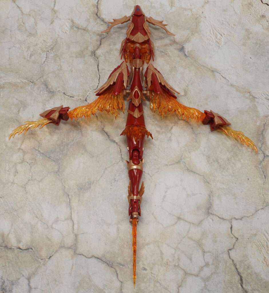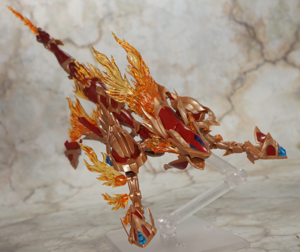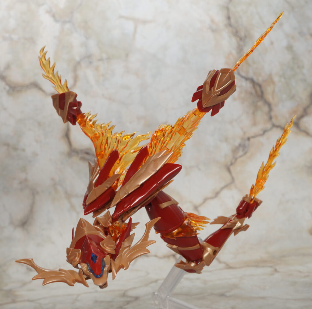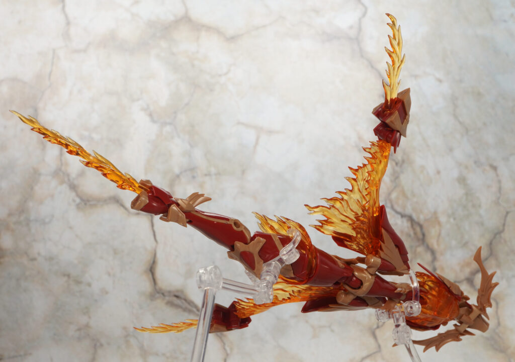 頭や翼の部分は軸可動でちょっとだけ動かせる感じで、長い胴体部分もヒザや足首になる部分が動くだけなので横方向に大きくクネクネしたポーズは採れません。