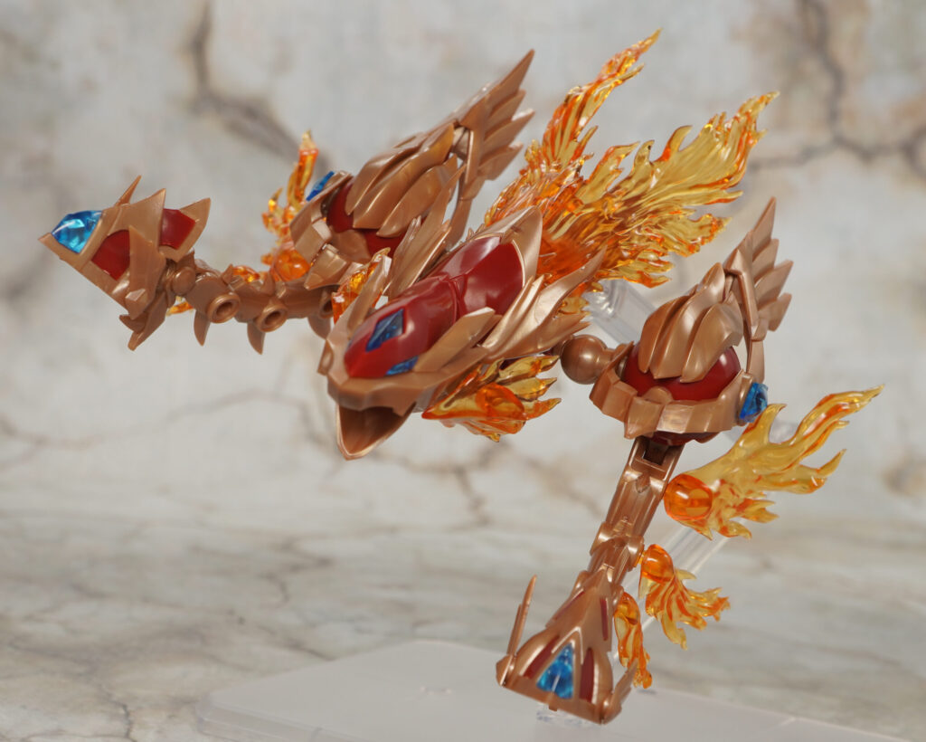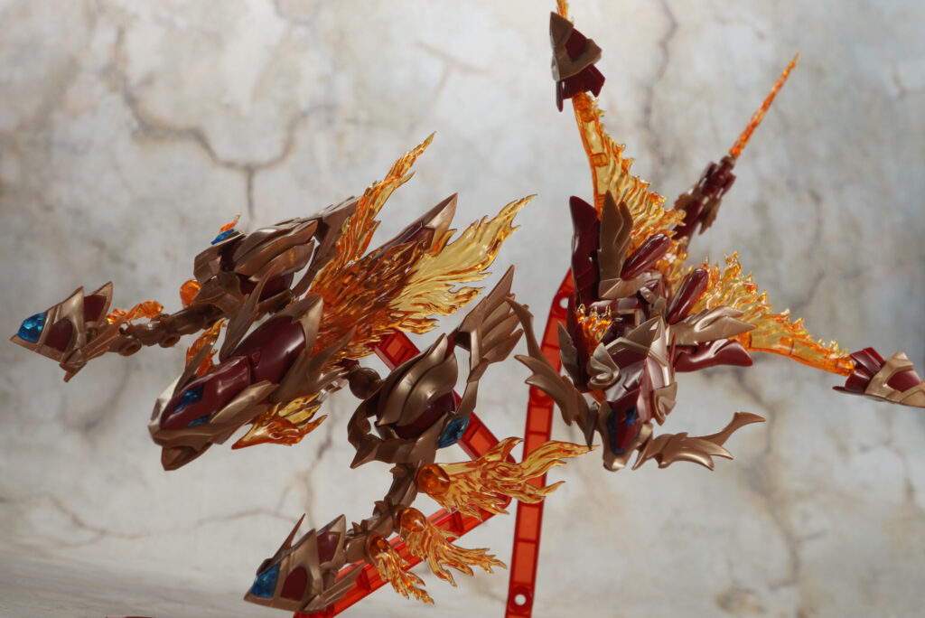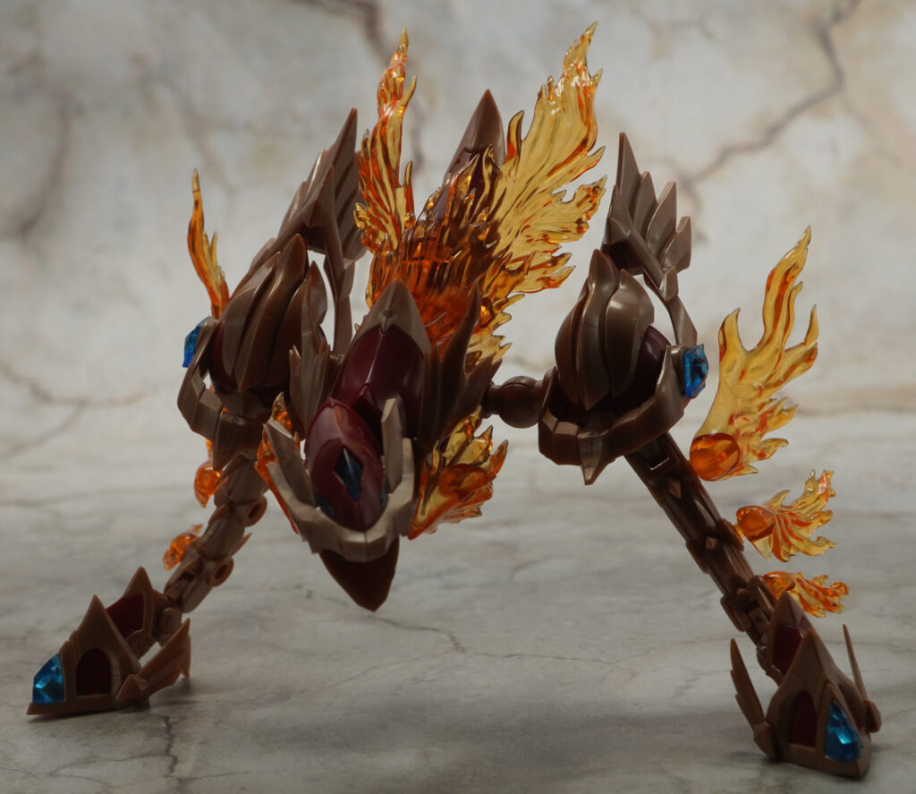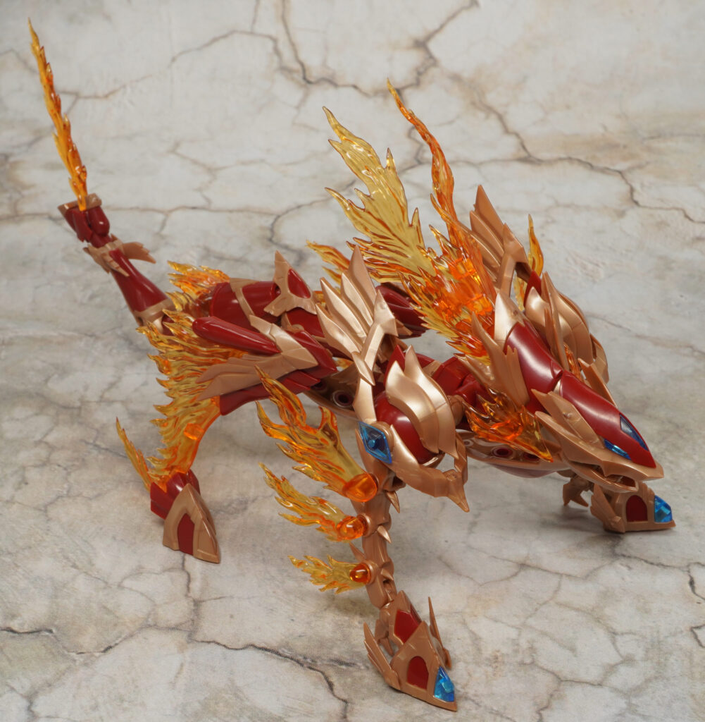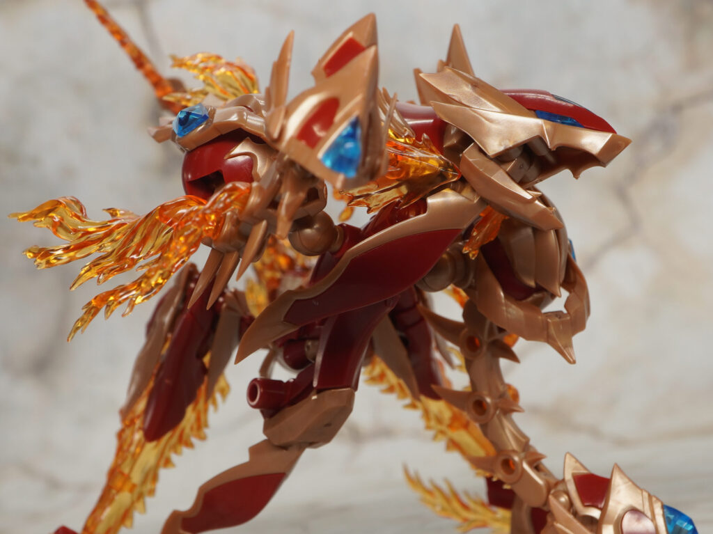 こちらが完成した【ゼノアルマ】フレイム シュトラールです。各所の燃え盛る炎の様なクリアエフェクトが特徴的な二本脚の火属性ゼノアルマ。