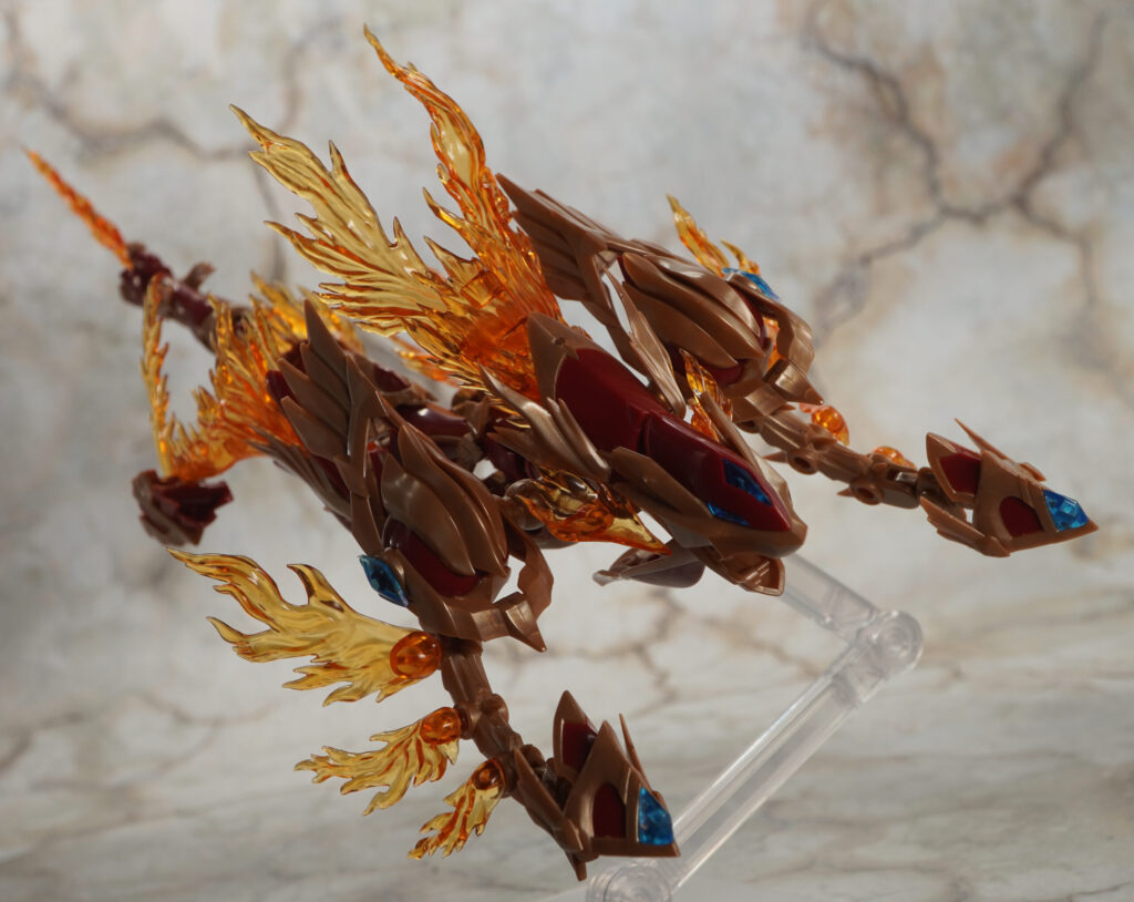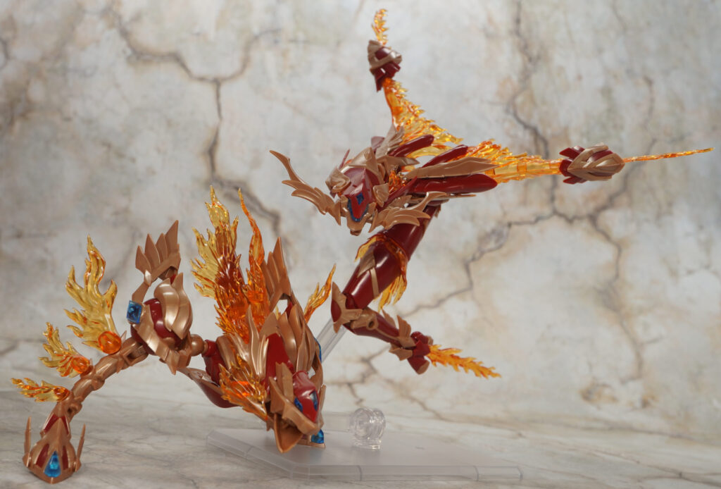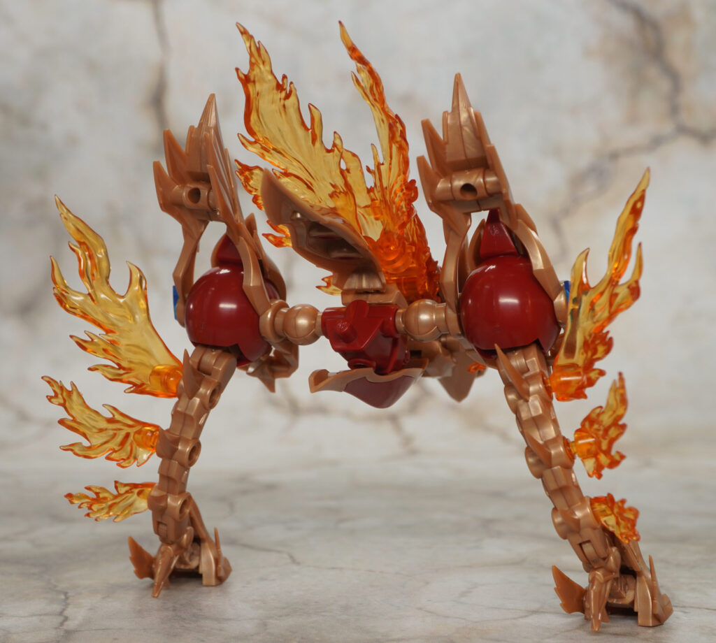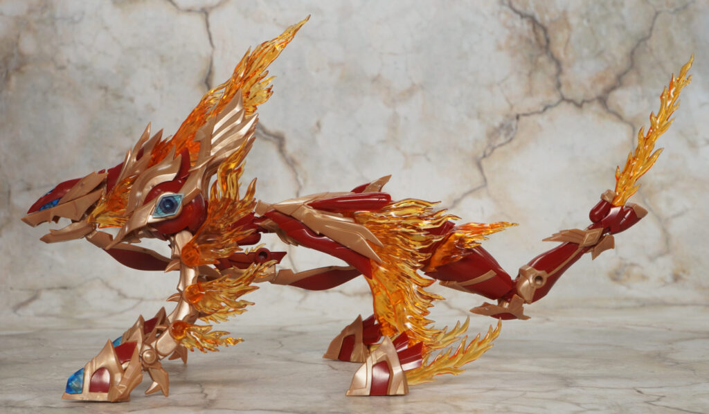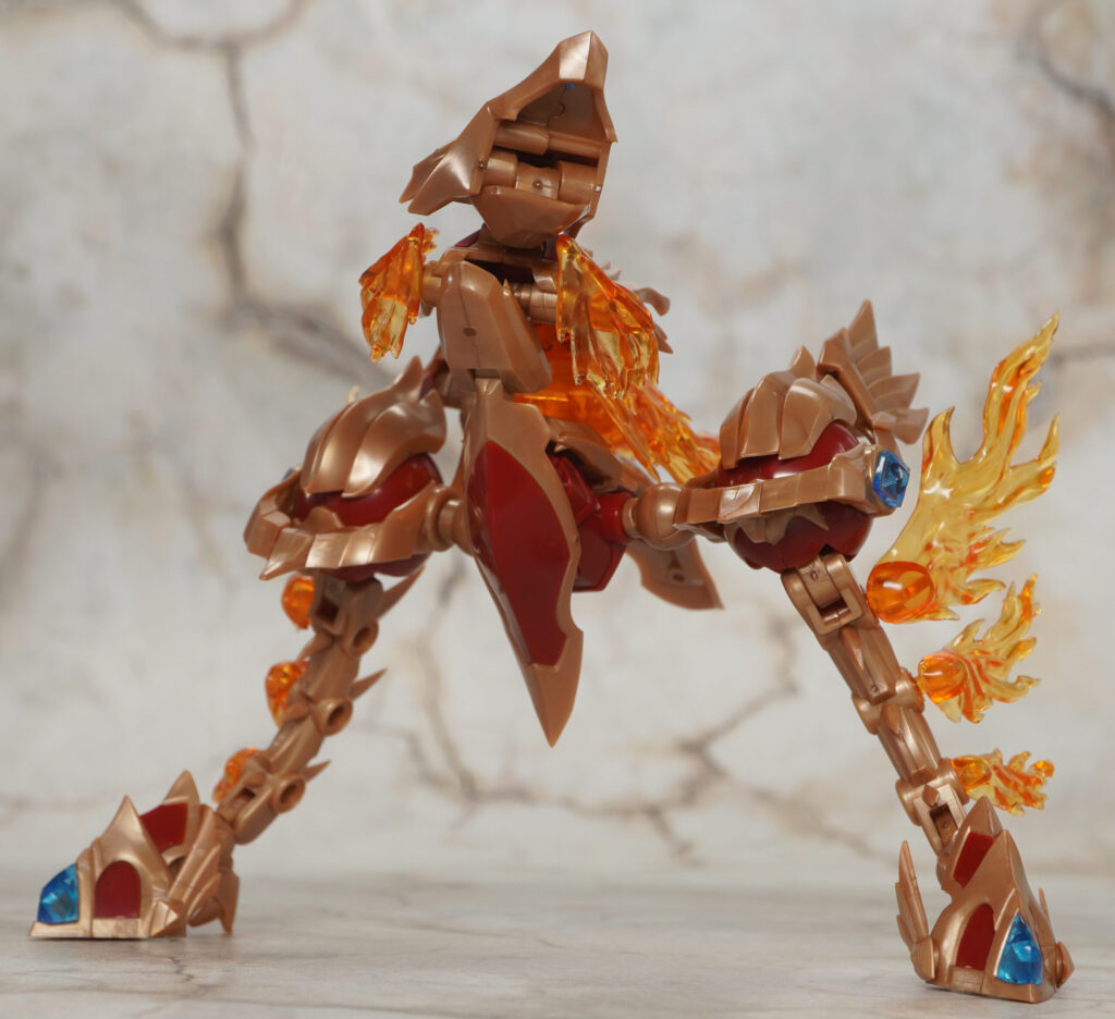 こちらが完成した【ゼノアルマ】フレイム シュトラールです。各所の燃え盛る炎の様なクリアエフェクトが特徴的な二本脚の火属性ゼノアルマ。