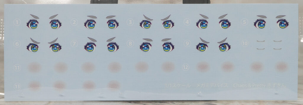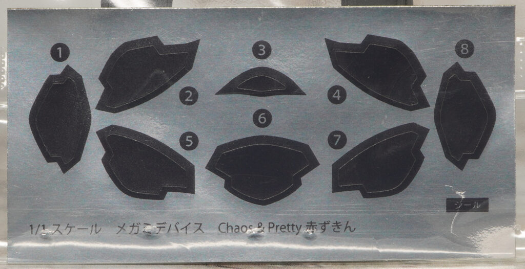 パッケージとシール、水転写デカール。瞳やチークを再現するデカールと、スカート上面の黒い部分を色分けするホイルシールが付属。