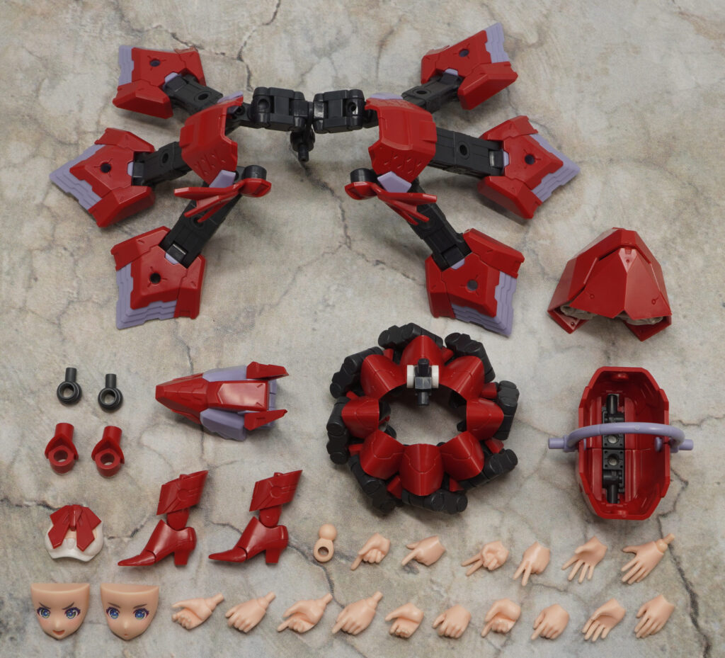 付属品は表情パーツ×3種、ハンドパーツ×9種、武装モード一式、ウルフヘッド、バスケット、手首部ジョイント×2種、FAガール対応首関節、展示ベースです。