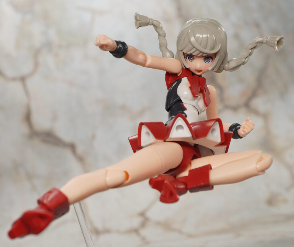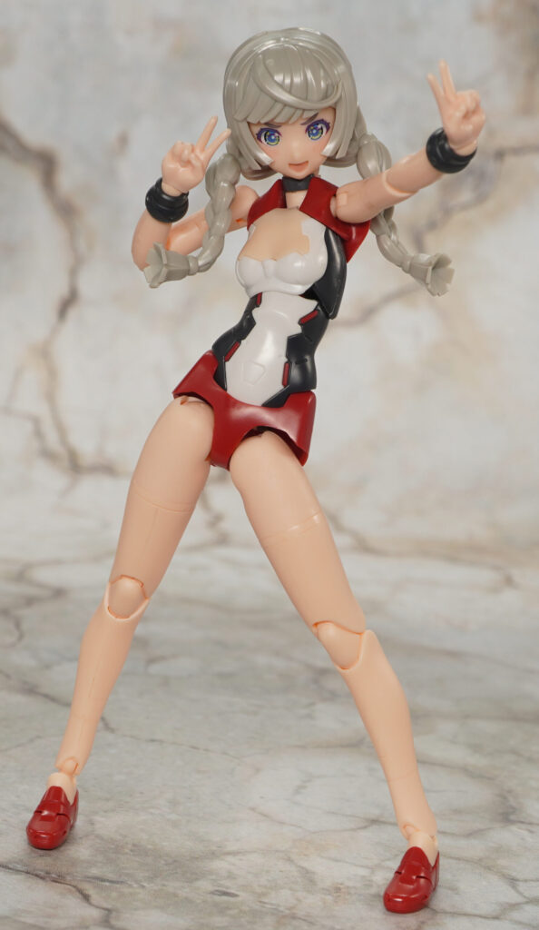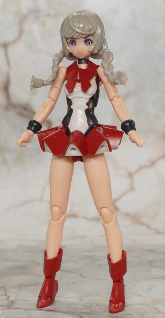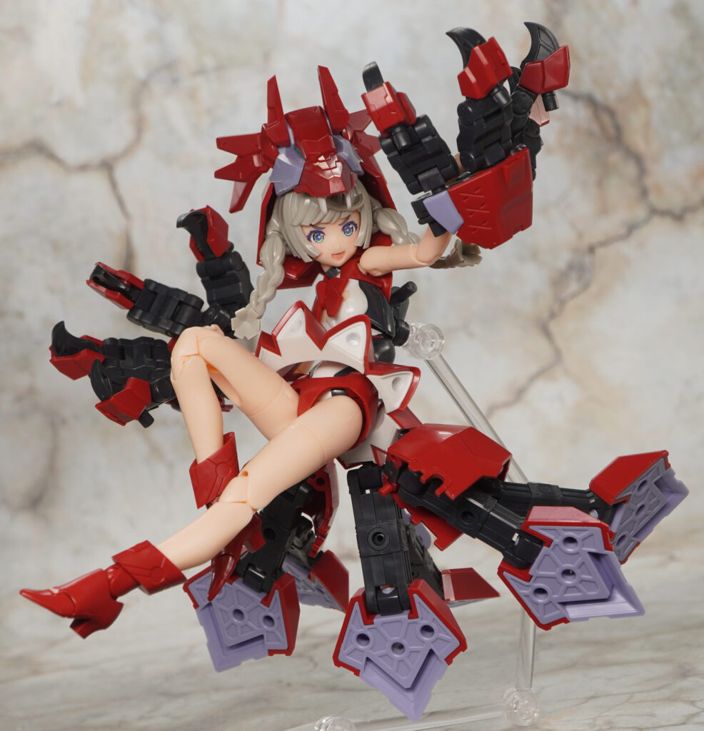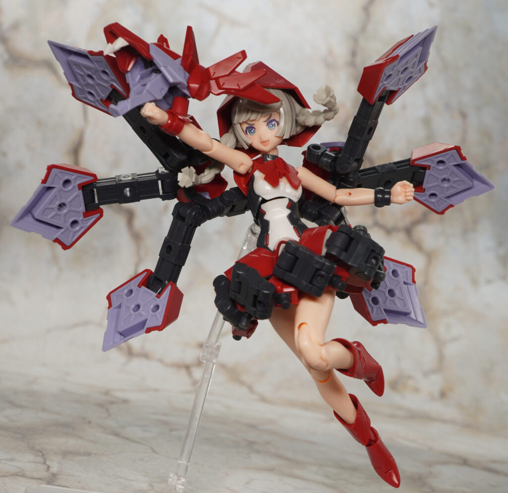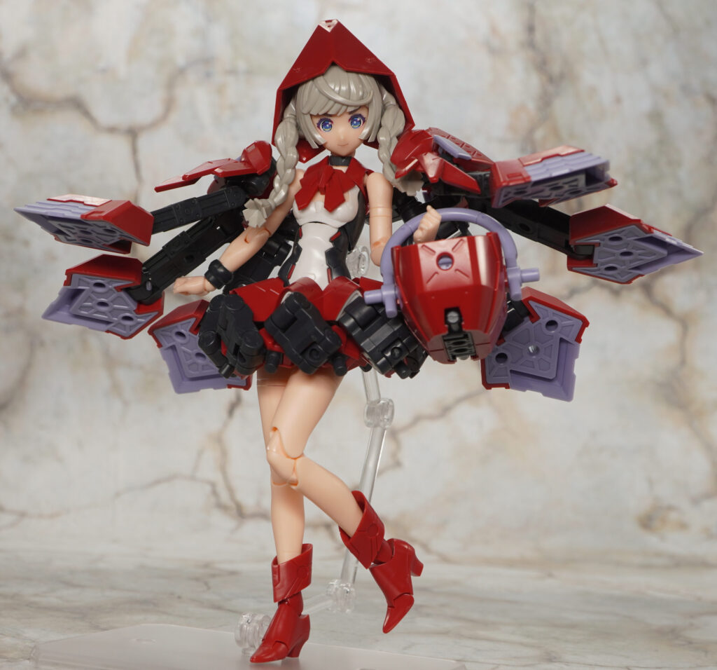 こちらが完成した【メガミデバイス】Chaos & Pretty 赤ずきんの素体モードです。”Chaos & Pretty”(カオプリ)シリーズのマジカルガールをベースにM.S.GフレキシブルアームBをミキシングし、他にも頭部や胴体、靴などに新規造形パーツを交えてグリム童話で有名な赤ずきんを再現したメガミ。